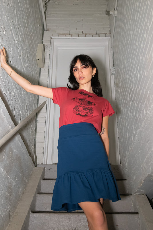 Combinez nos différents modèles de jupes avec nos t-shirts classiques imprimés à la main, nos chemisiers intemporels, nos crewnecks pour les soirées fraîches et nos camisoles pour profiter pleinement de l’été.