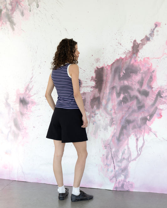 Nos shorts s’agencent parfaitement à nos camisoles réversibles, nos t-shirts sérigraphiés à la main par Eve Lavoie dans notre atelier de Montréal ou bien nos chemisiers d’été, telle que la chemise Hersé.