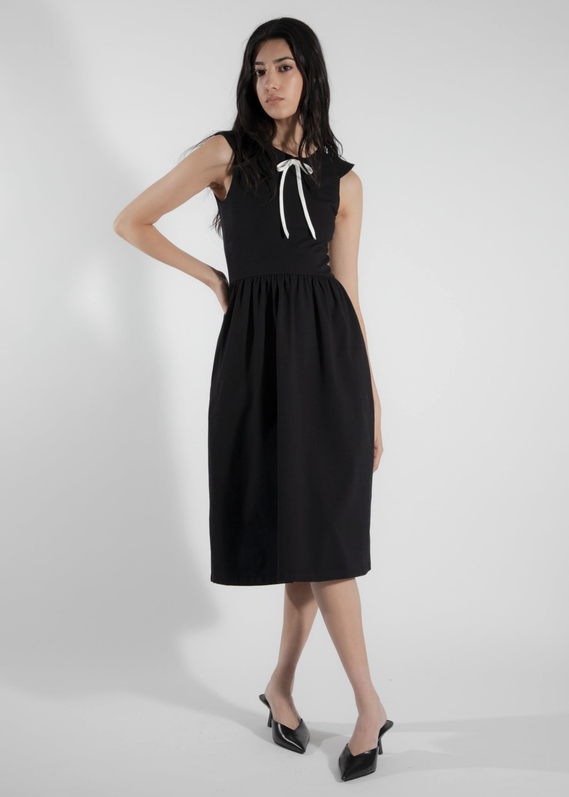 Reversible matelot-style front/back dress, with shawl collar on one side and pointed claudine collar on the other. Side pockets. Pleated at the waist and length below the knees. Tight-fitting and sleeveless.