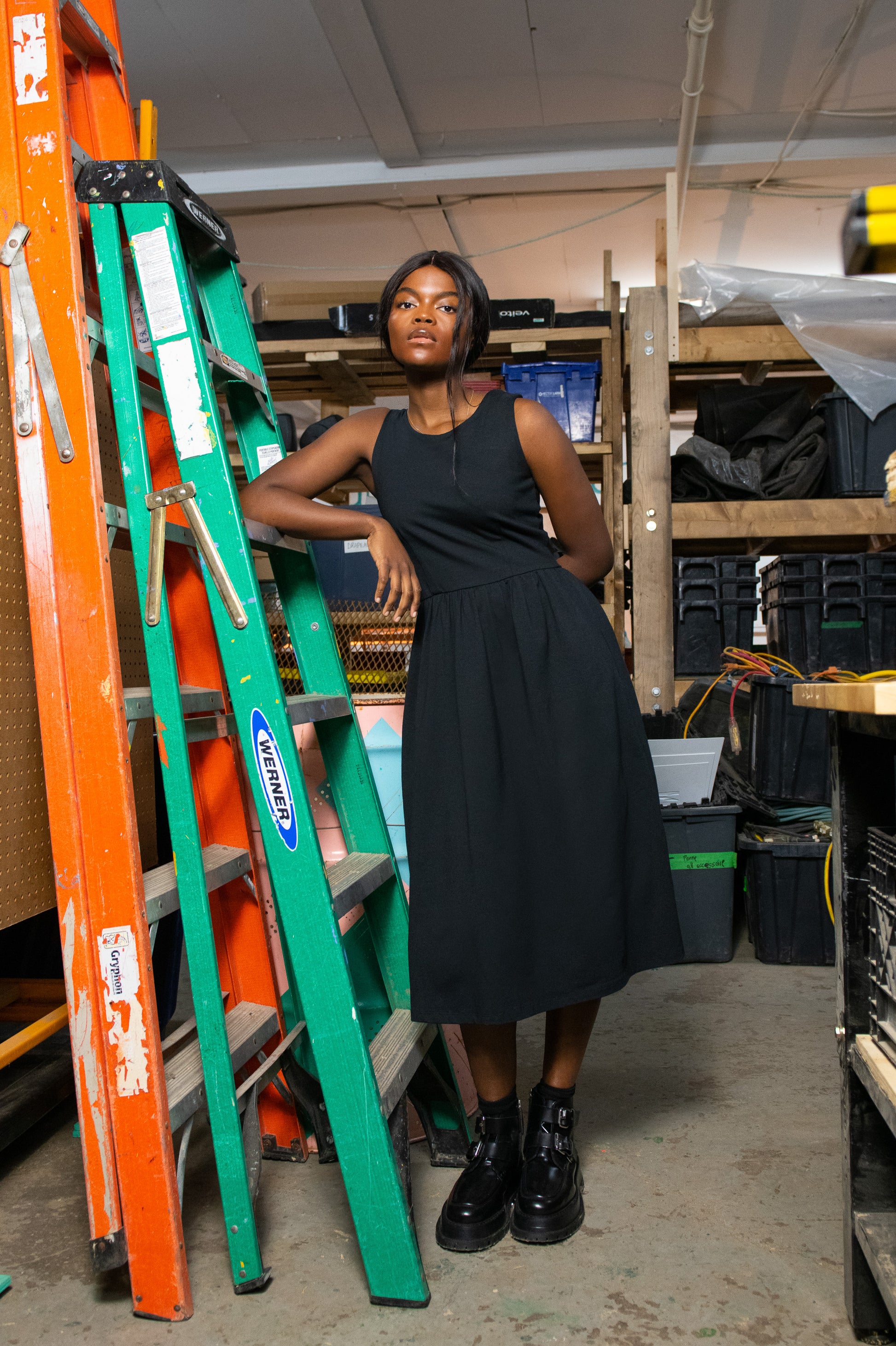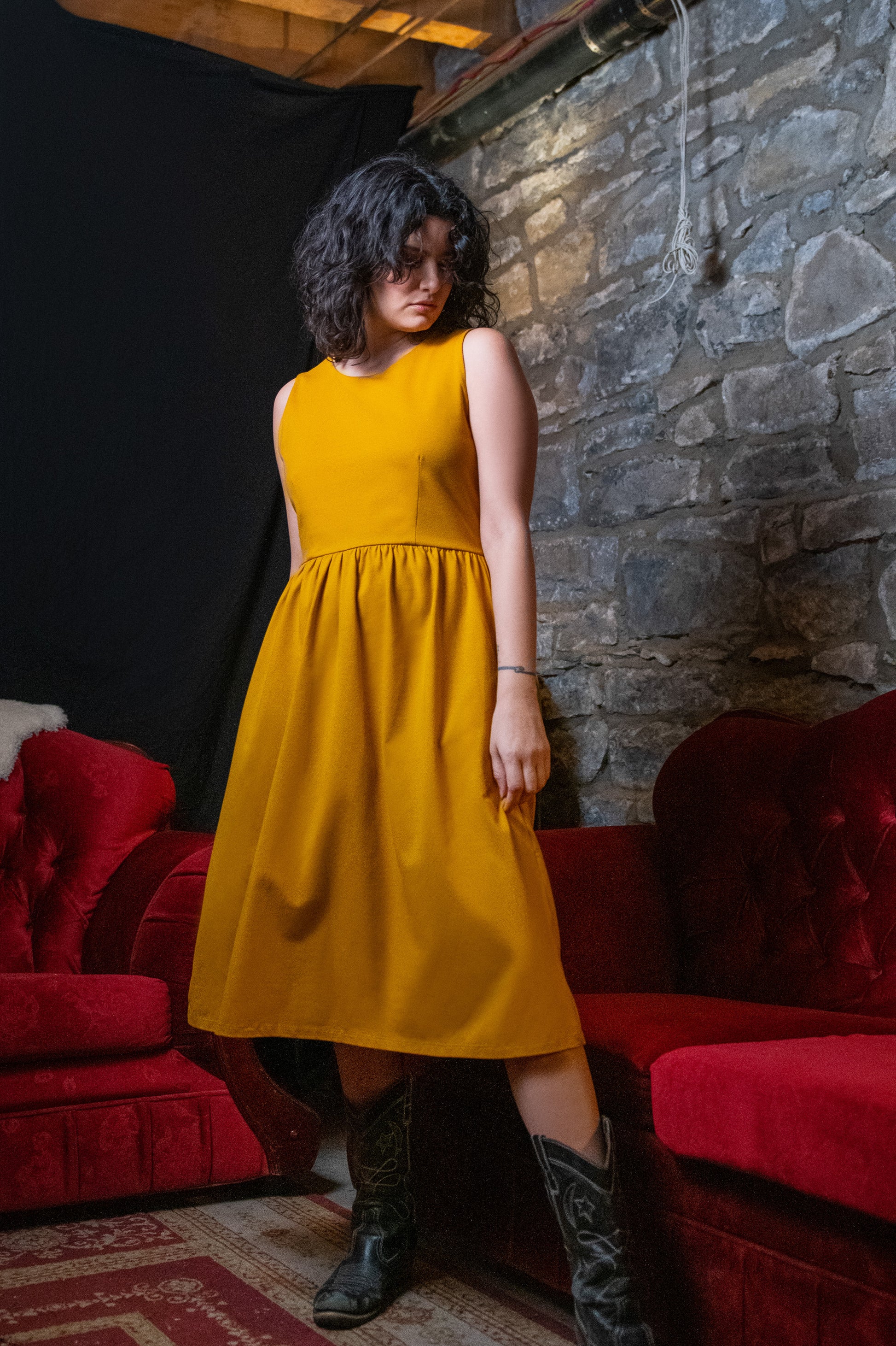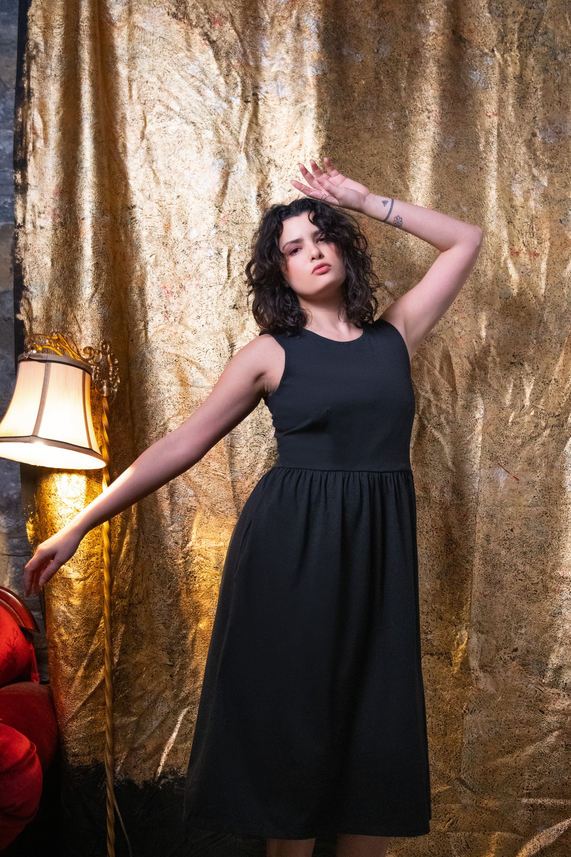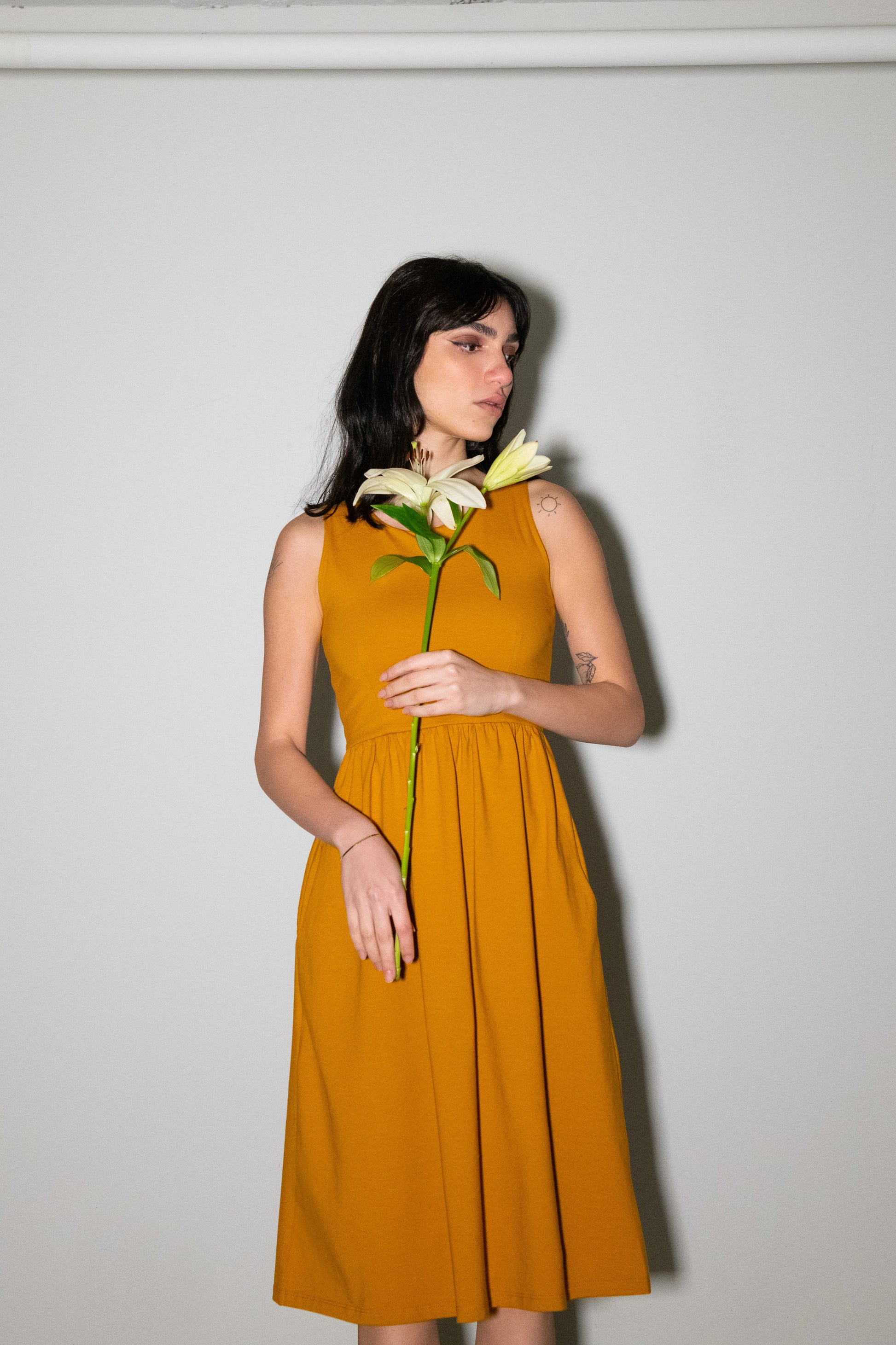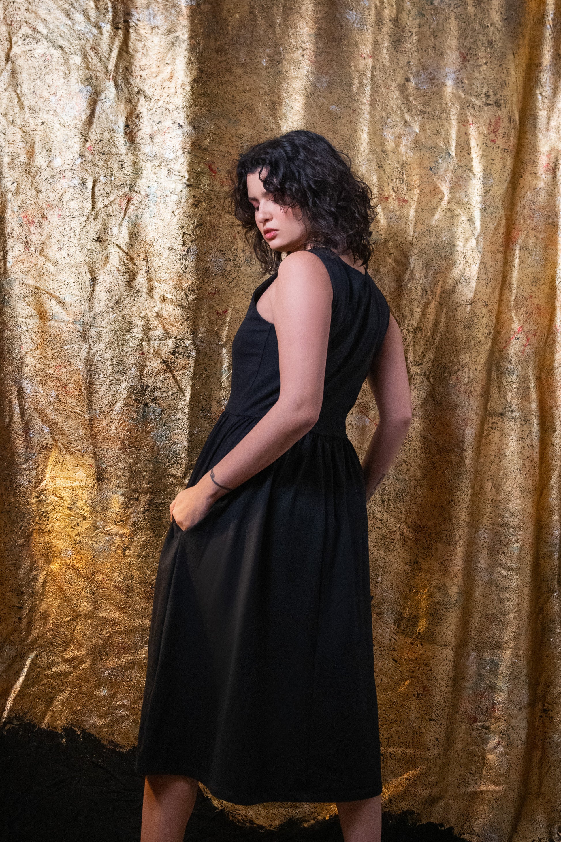 Robe midi sans manche et plissée à la taille avec poches latérales.