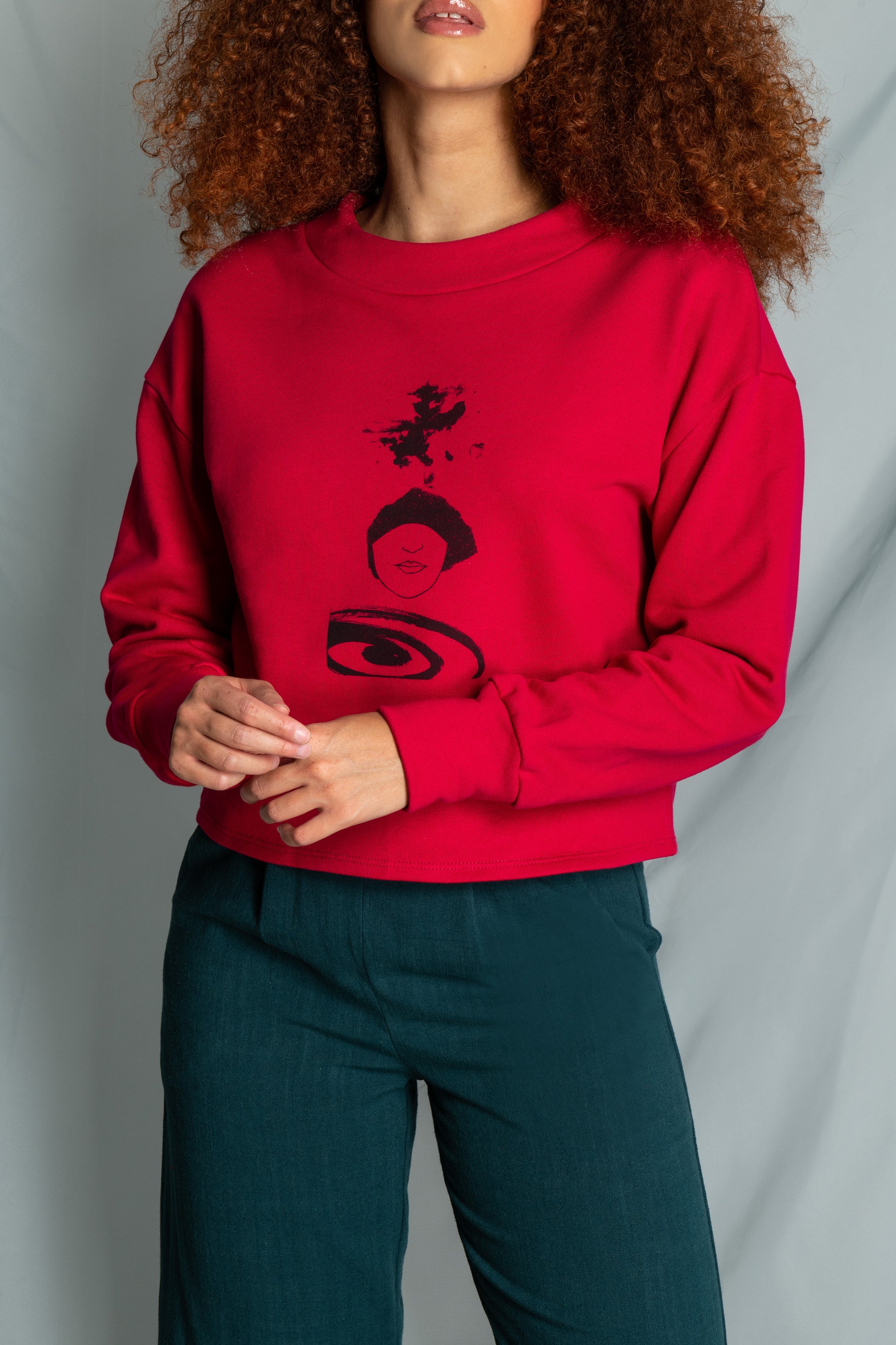 La pièce parfaite pour vous réconforter tout l’hiver. Sur ce doux tricot de coton recyclé, nous avons imprimé des sérigraphies faits à partir de dessins, de collage et d’encre de Chine, le tout, réalisé à l’atelier par Eve. Coupe ample, tombée sur les hanches et manches cintrées aux poignets.