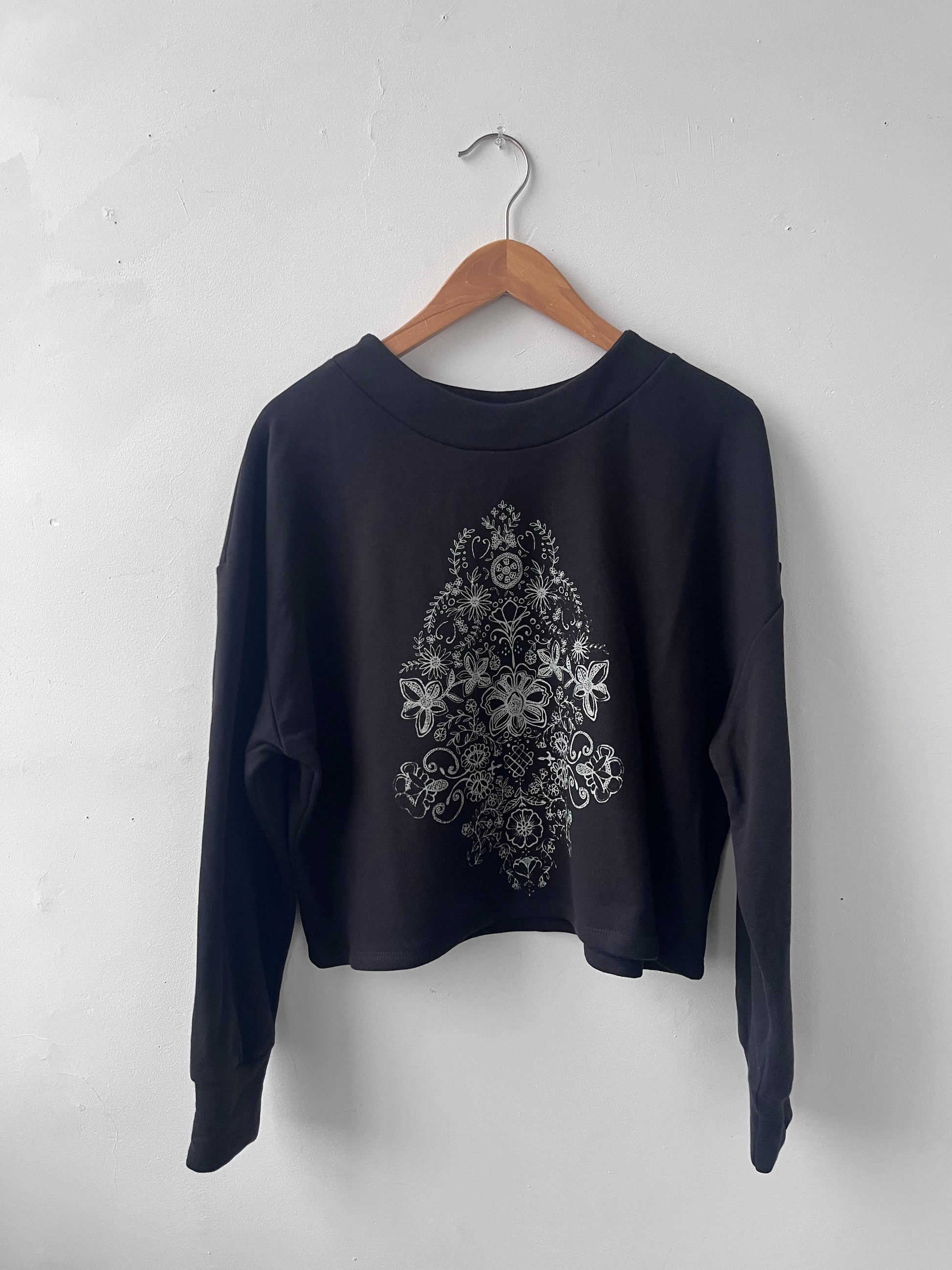 Chandail en coton ouaté à la coupe ample et confortable. Col rond délicat et longueur légèrement au-dessus des hanches. L'imprimé fut conçu par Eve en s'inspirant des broderies anglaises, et le tout a été sérigraphié à l'atelier. Disponible en noir, violet, bleu marine, citrouille.