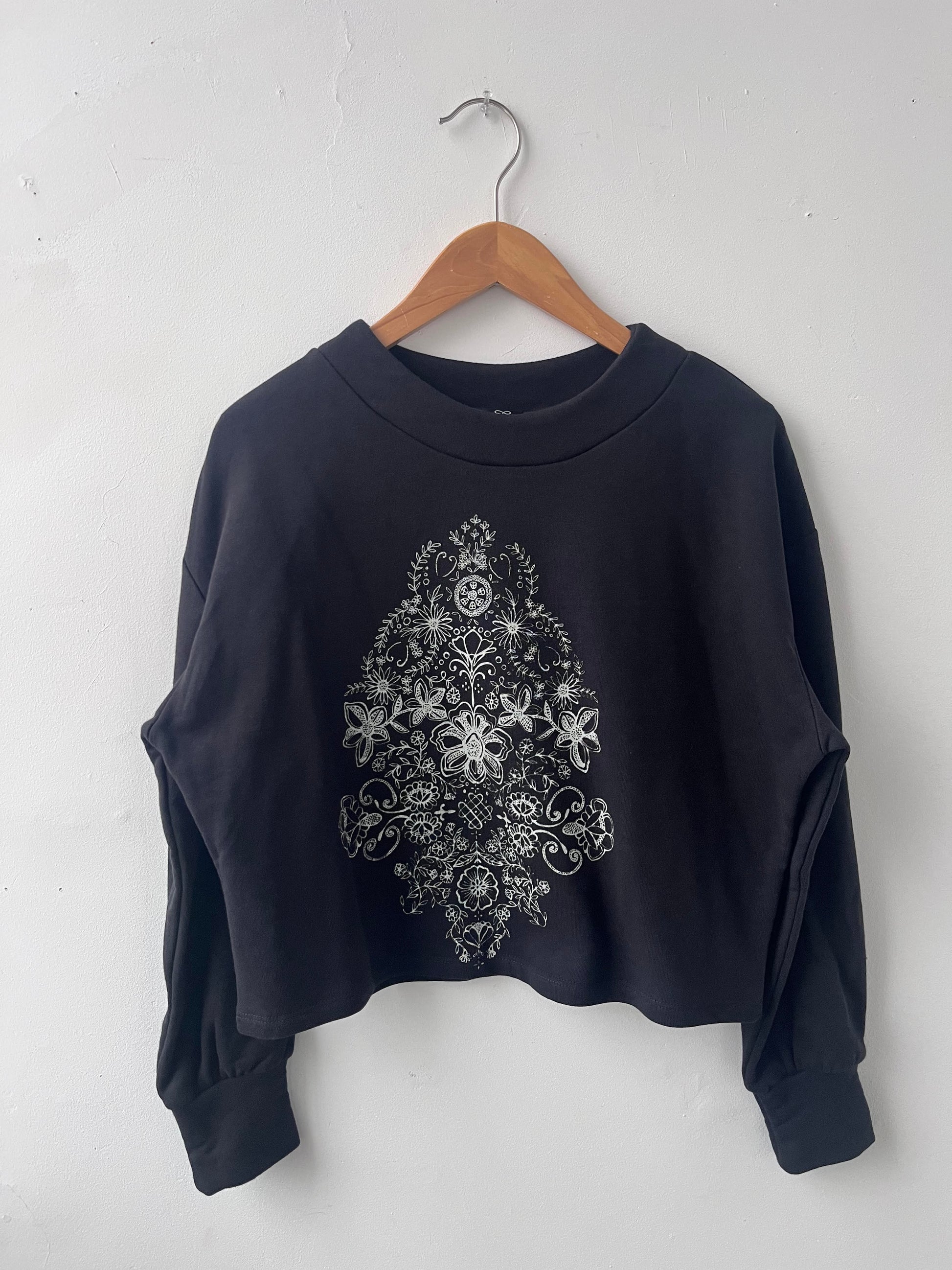 Chandail en coton ouaté à la coupe ample et confortable. Col rond délicat et longueur légèrement au-dessus des hanches. L'imprimé fut conçu par Eve en s'inspirant des broderies anglaises, et le tout a été sérigraphié à l'atelier. Disponible en noir, violet, bleu marine, citrouille.
