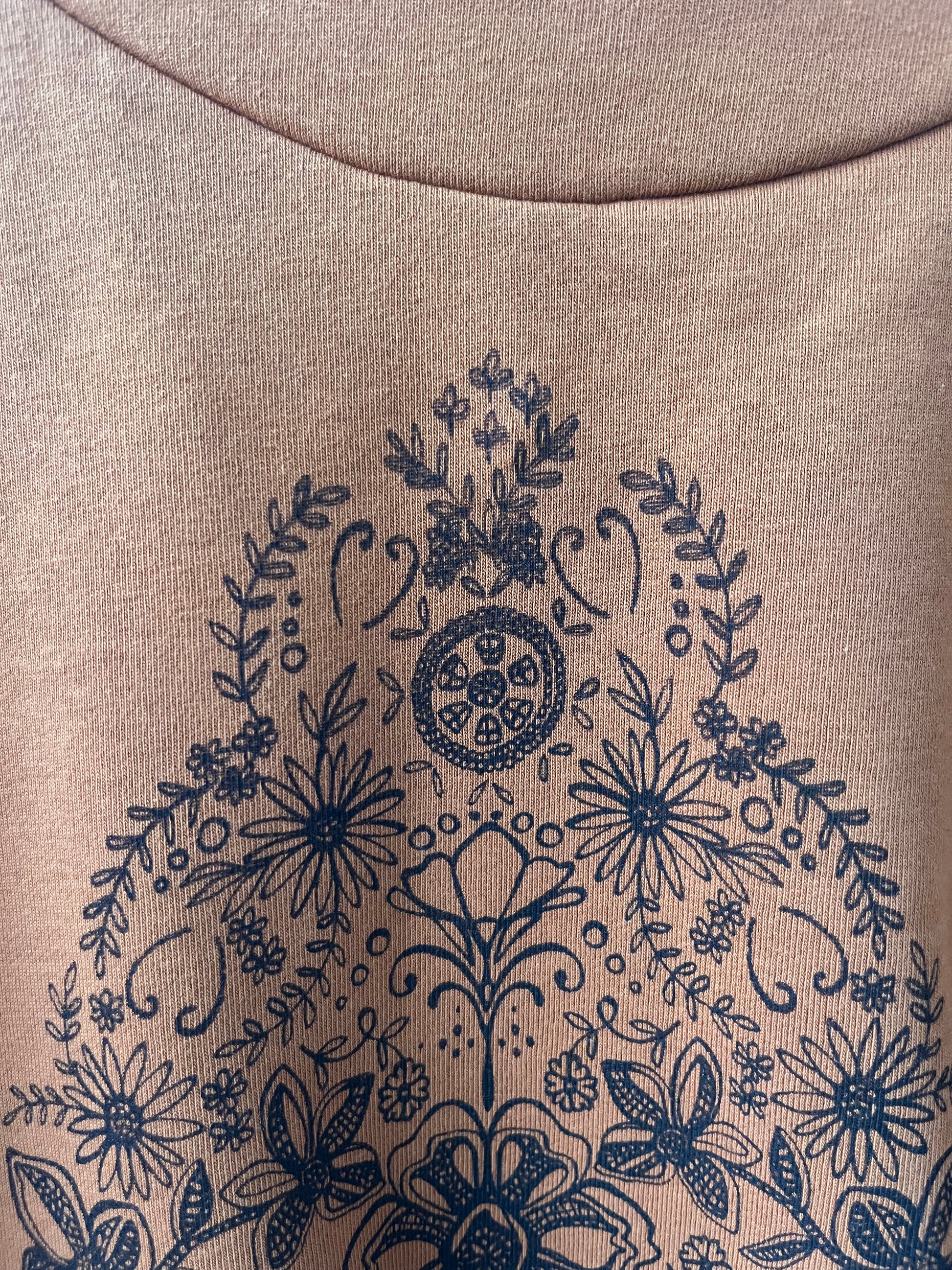 Chandail en coton ouaté à la coupe ample et confortable. Col rond délicat et longueur légèrement au-dessus des hanches. L'imprimé fut conçu par Eve en s'inspirant des broderies anglaises, et le tout a été sérigraphié à l'atelier. Disponible en noir, violet, bleu marine, citrouille.