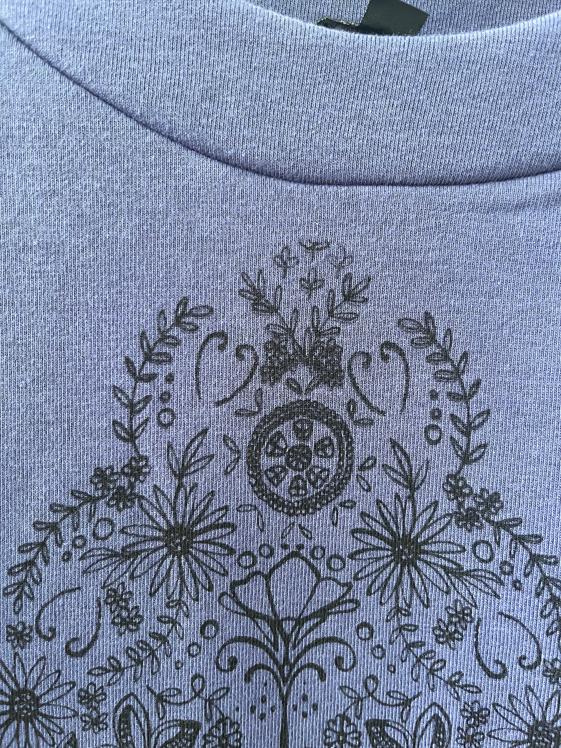 Chandail en coton ouaté à la coupe ample et confortable. Col rond délicat et longueur légèrement au-dessus des hanches. L'imprimé fut conçu par Eve en s'inspirant des broderies anglaises, et le tout a été sérigraphié à l'atelier. Disponible en noir, violet, bleu marine, citrouille.