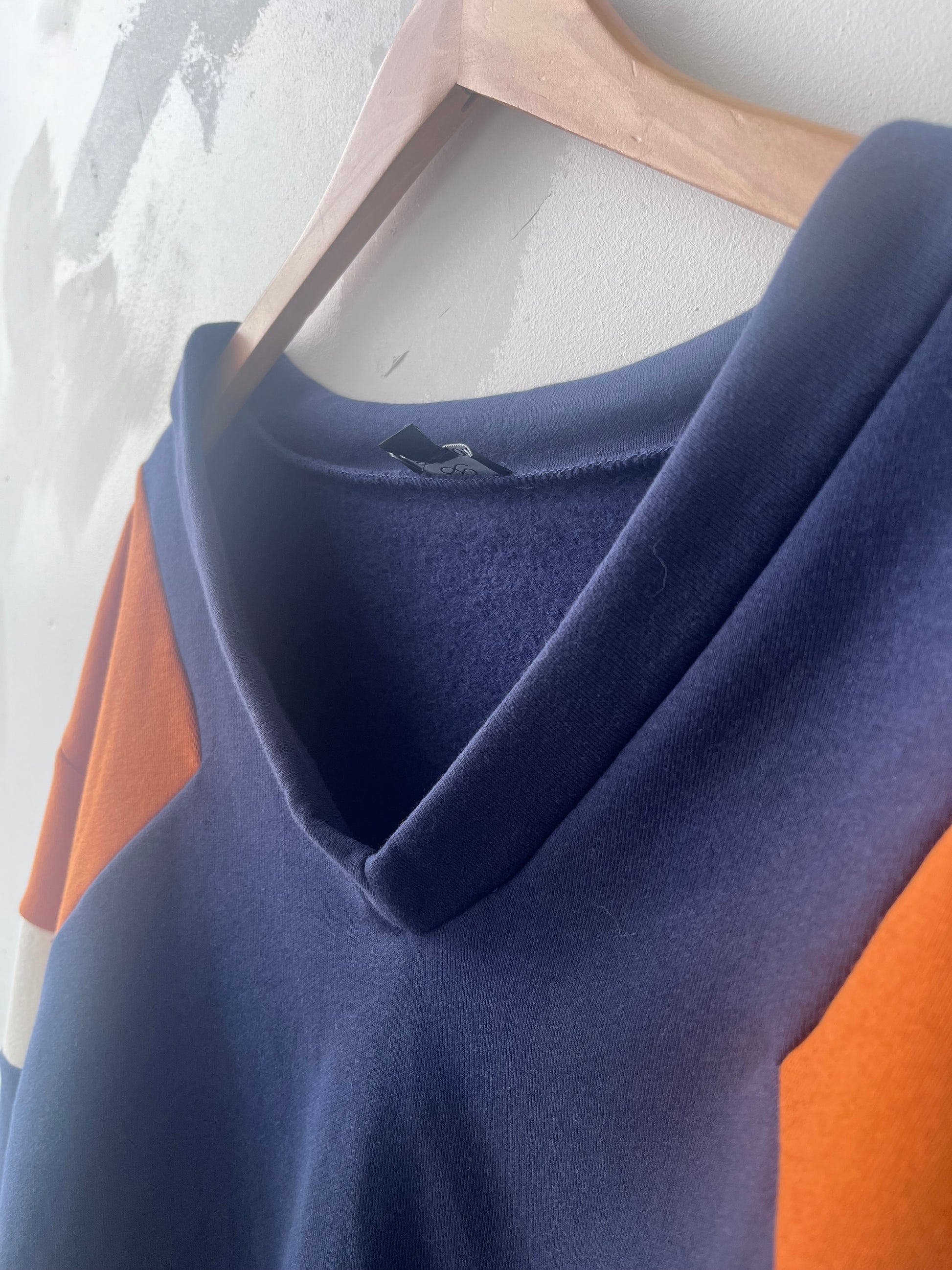 Chandail en coton ouaté à la coupe ample et confortable. Col en V délicat et longueur légèrement au-dessus des hanches. Ses découpes originales lui apportent une touche unique et actuelle. Disponible en noir, violet et blanc ou bleu marine, citrouille et blanc.