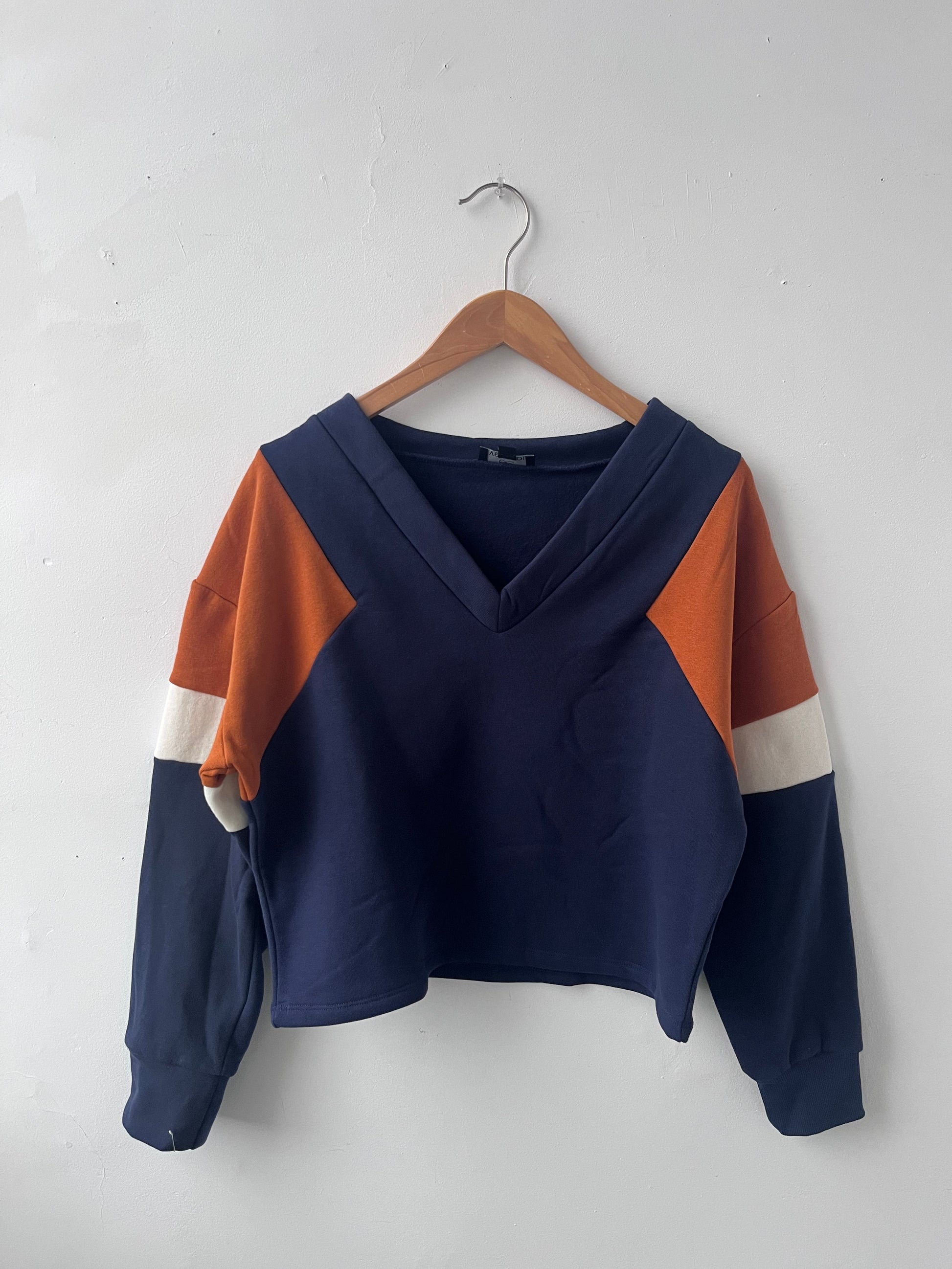 Chandail en coton ouaté à la coupe ample et confortable. Col en V délicat et longueur légèrement au-dessus des hanches. Ses découpes originales lui apportent une touche unique et actuelle. Disponible en noir, violet et blanc ou bleu marine, citrouille et blanc.