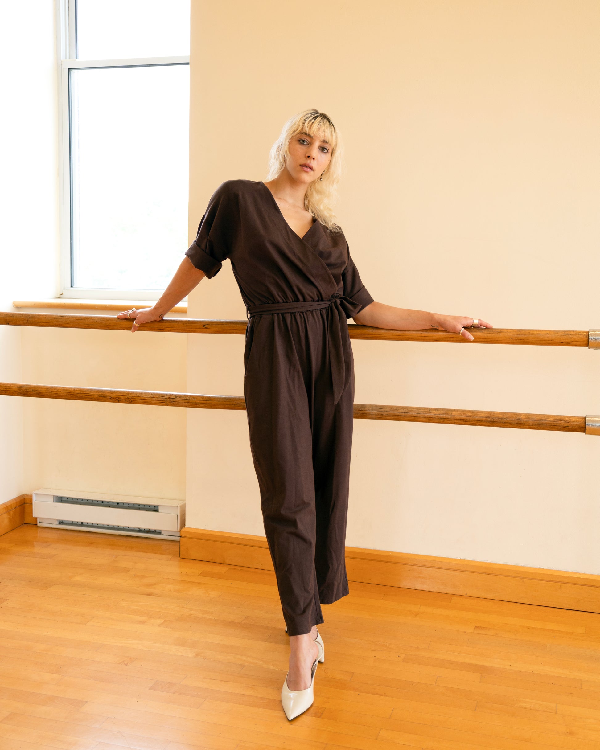 Un basique révisé pour la saison froide avec l'ajout de manches. Cette combinaison croisée à l'avant s'enfile facilement grâce à une bande de taille élastique. Elle est dotée d'une ceinture amovible, de jambes amples, d'une longueur cheville et de poches latérales en biais. Disponible en coton Oeko-tex noir, chocolat ou violet, ou en tissu scintillant noir.