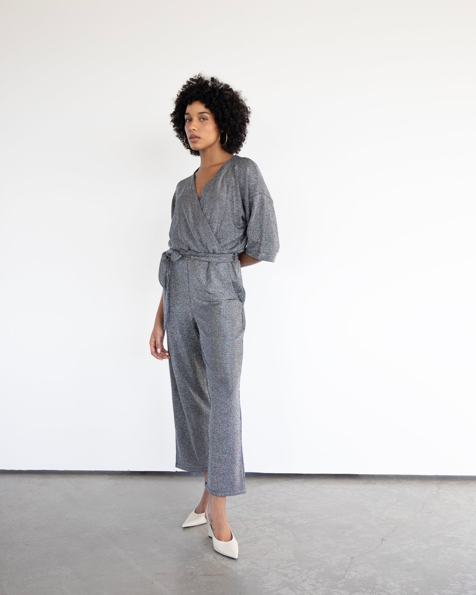 Un basique révisé pour la saison froide avec l'ajout de manches. Cette combinaison croisée à l'avant s'enfile facilement grâce à une bande de taille élastique. Elle est dotée d'une ceinture amovible, de jambes amples, d'une longueur cheville et de poches latérales en biais. Disponible en coton Oeko-tex noir, chocolat ou violet, ou en tissu scintillant noir.
