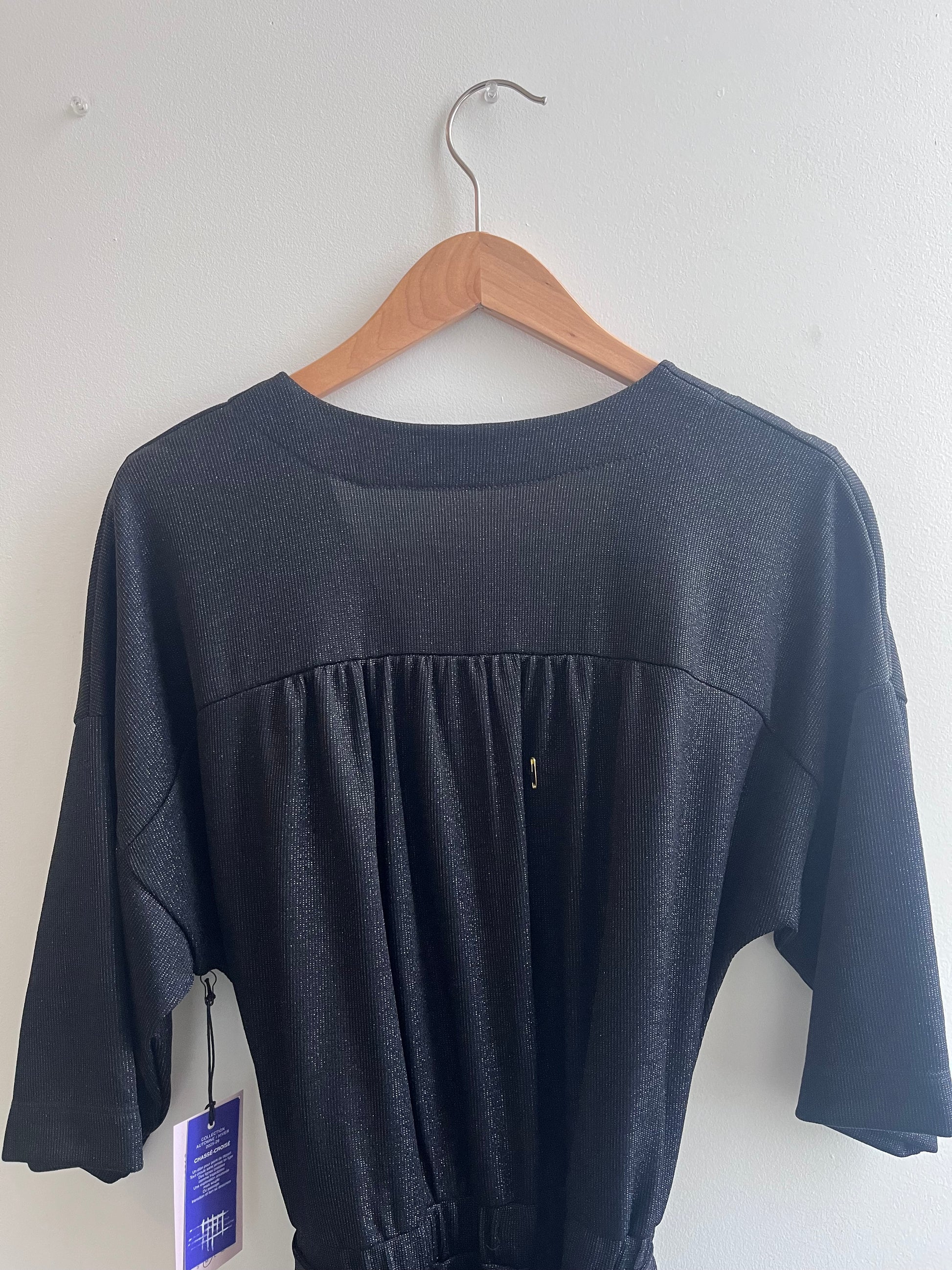 Un basique révisé pour la saison froide avec l'ajout de manches. Cette combinaison croisée à l'avant s'enfile facilement grâce à une bande de taille élastique. Elle est dotée d'une ceinture amovible, de jambes amples, d'une longueur cheville et de poches latérales en biais. Disponible en coton Oeko-tex noir, chocolat ou violet, ou en tissu scintillant noir.