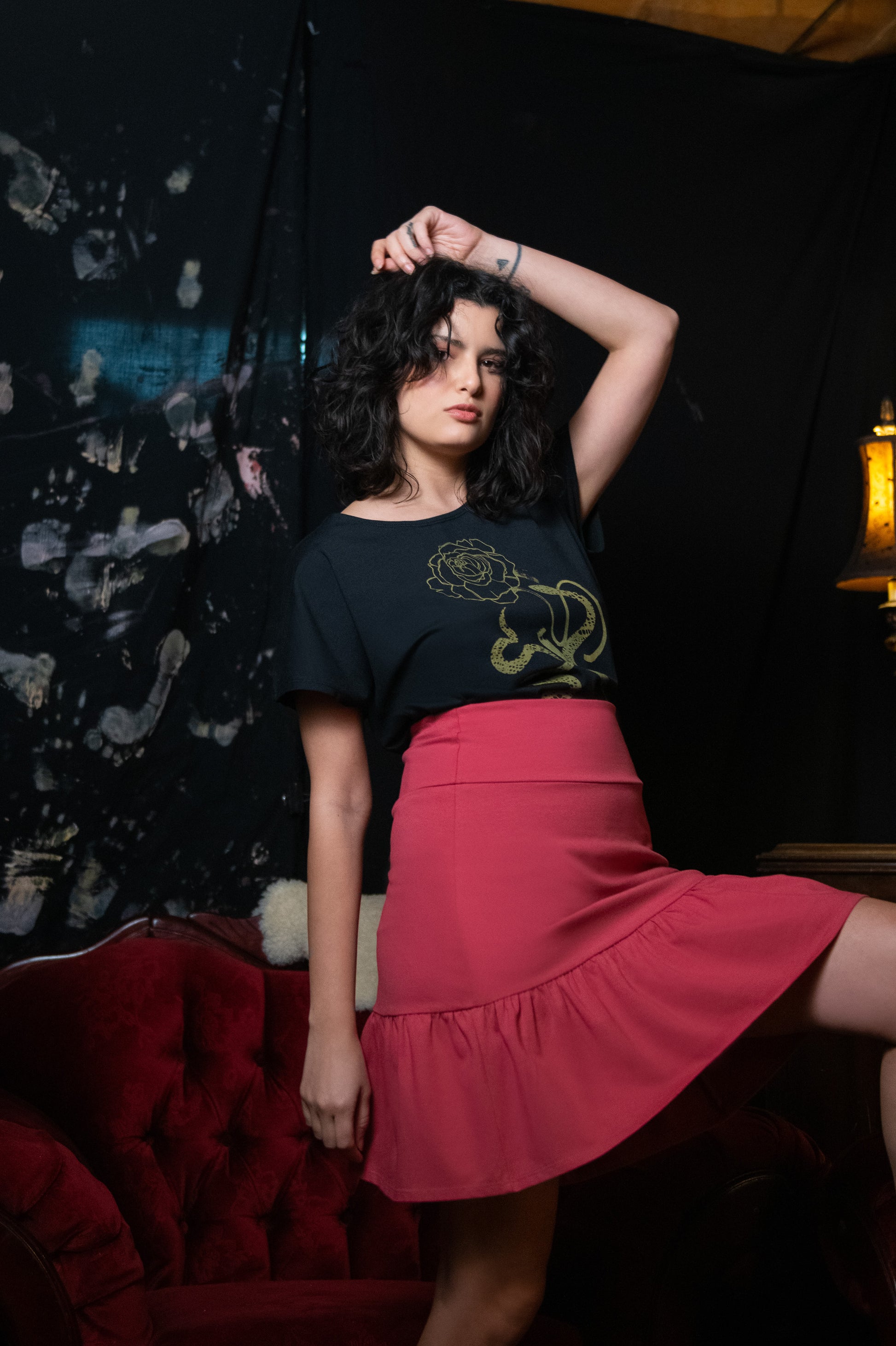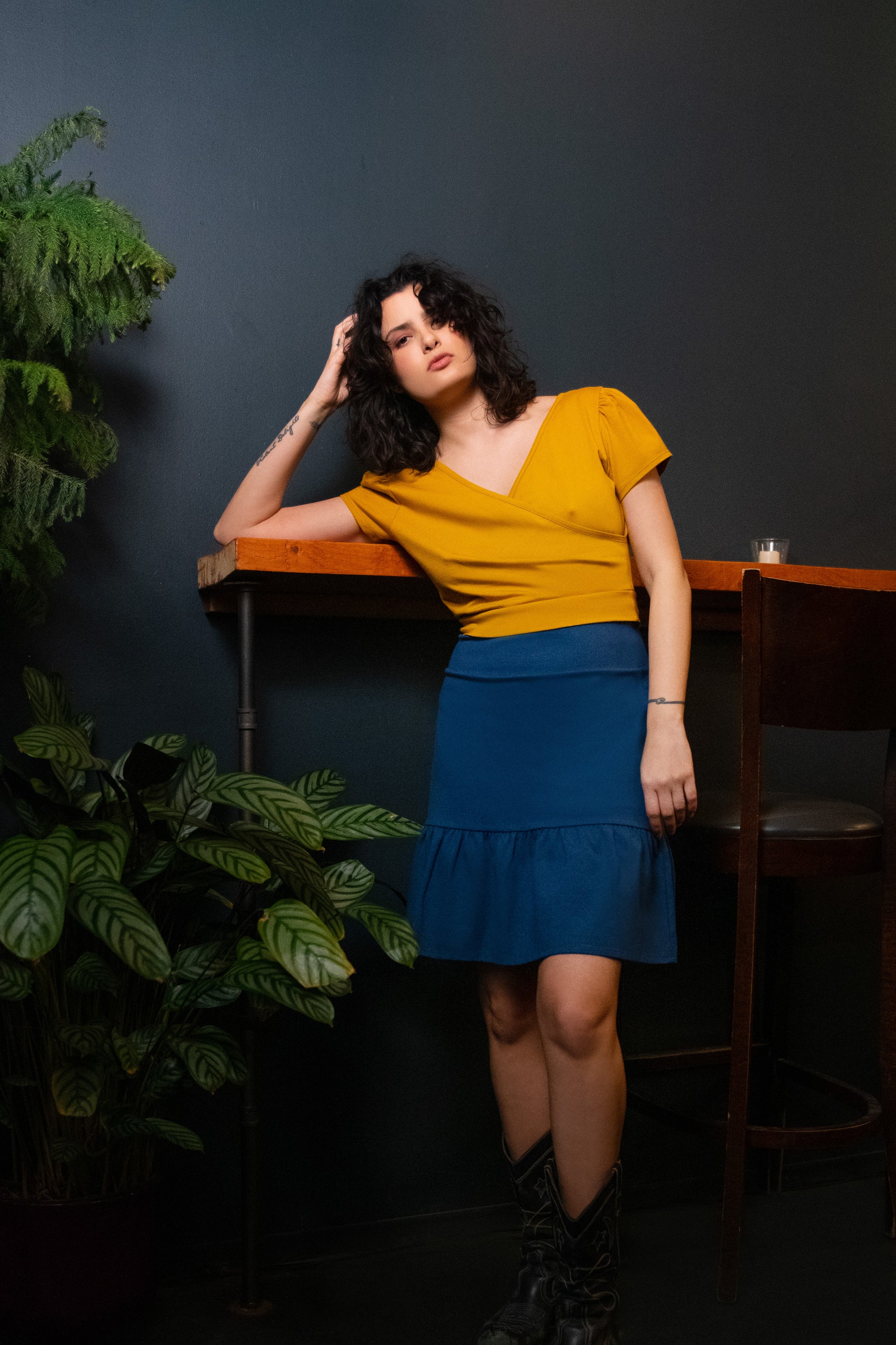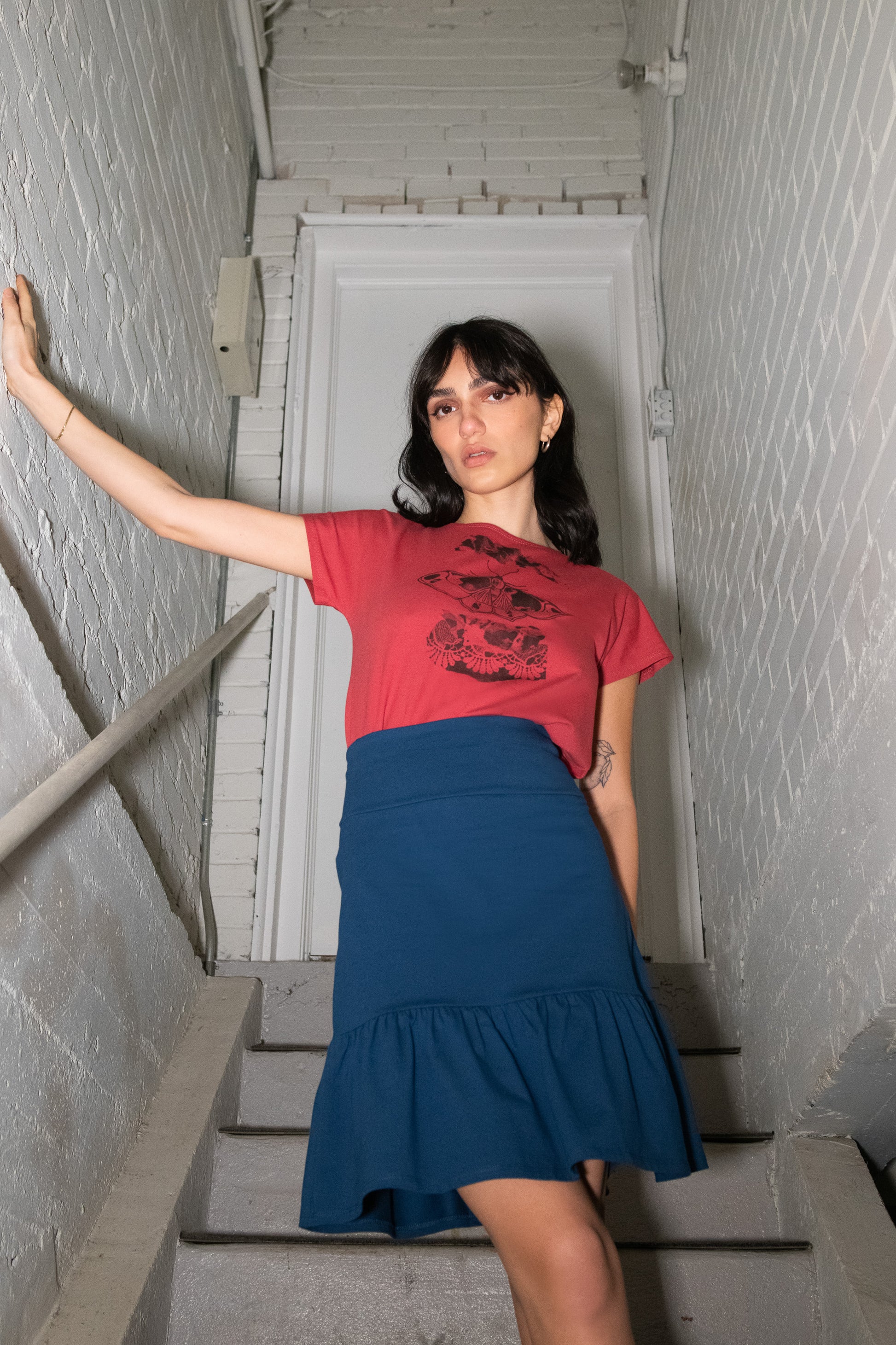 Jupe courte en coton avec volant à la base. S’adapte à toutes les silhouettes. Bande de taille extensible, longueur aux genoux.