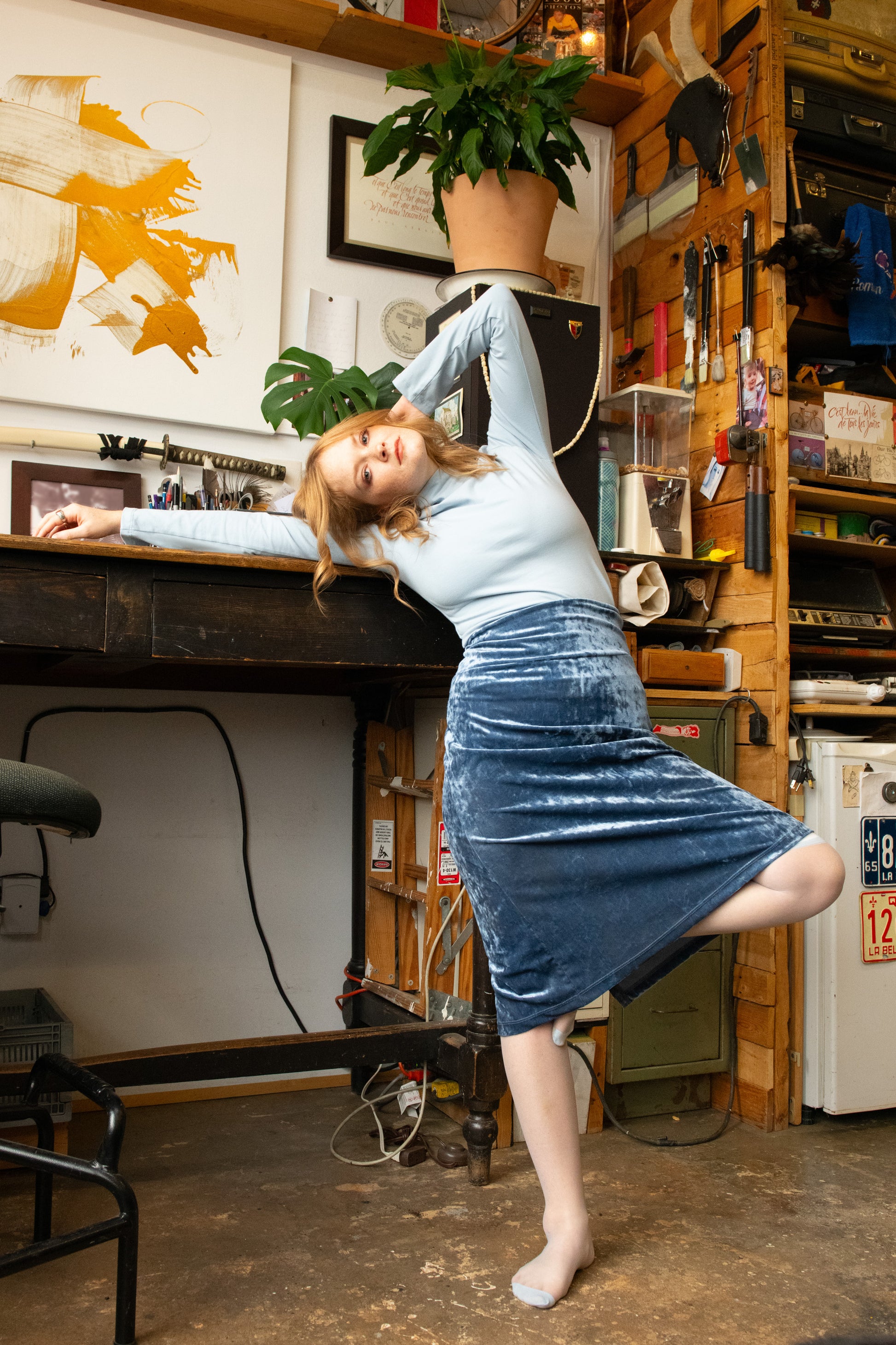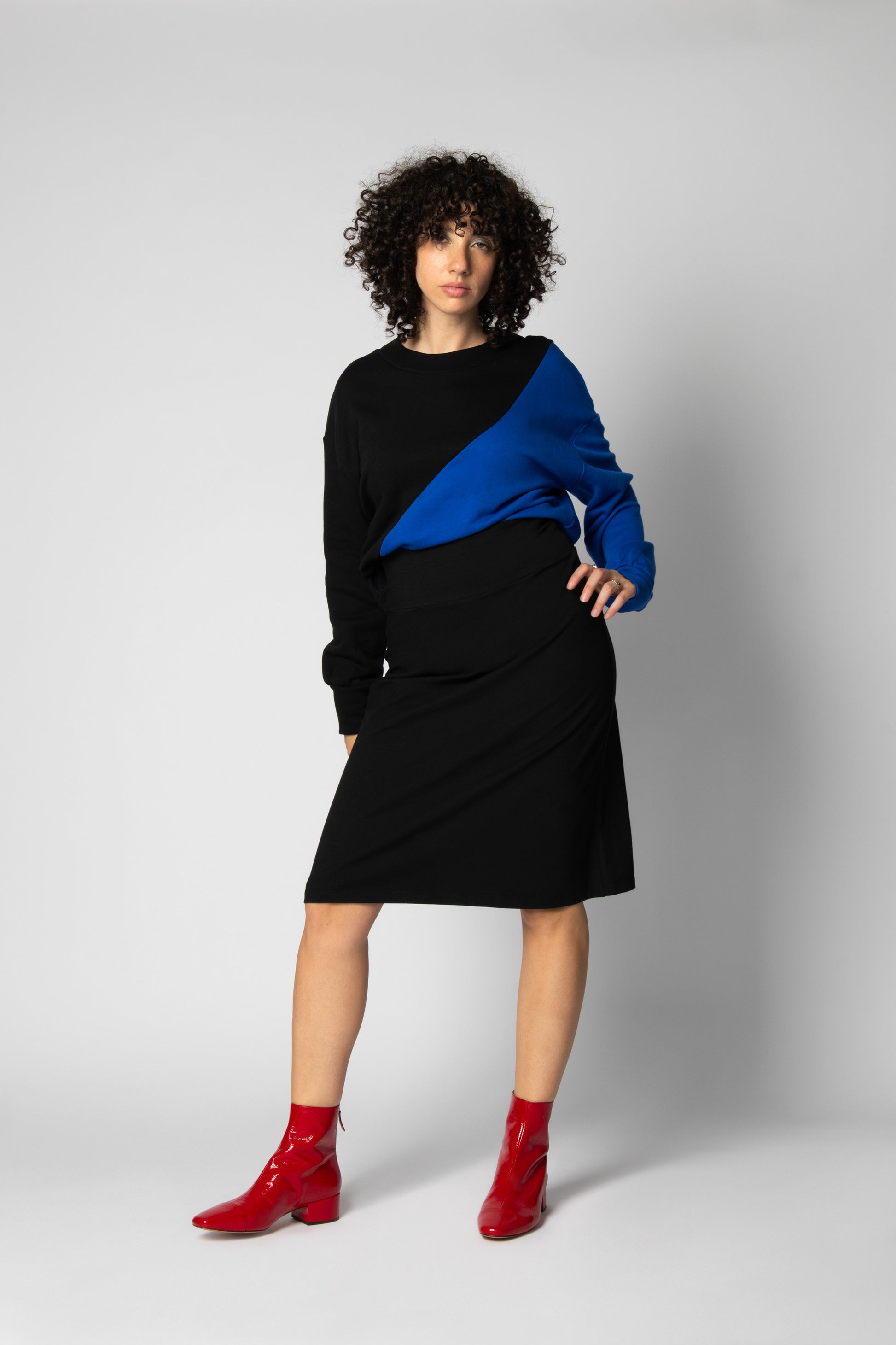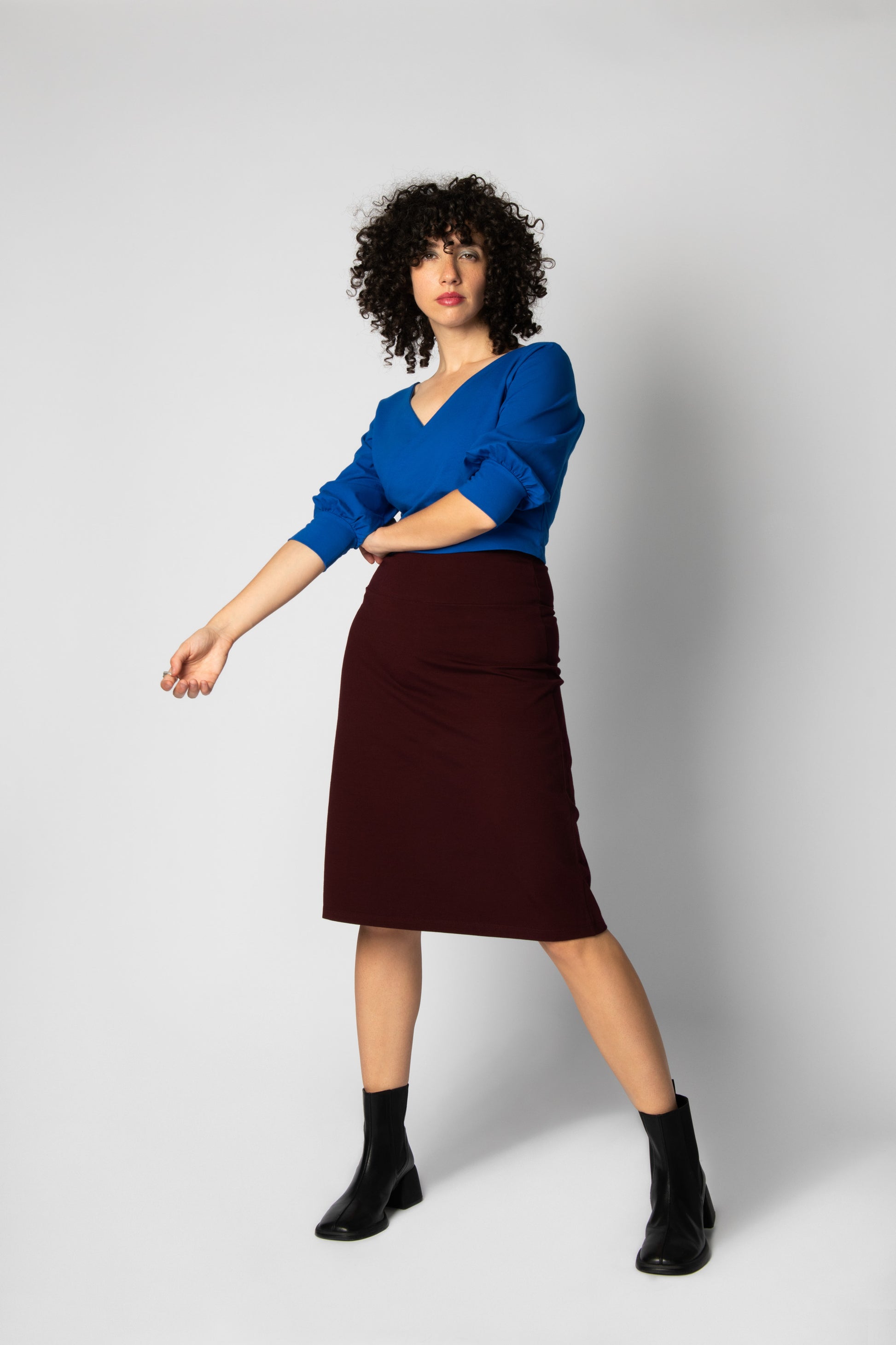 Jupe droite avec bande de taille extensible à porter avec un crewneck ou un col roulé selon l’occasion. Longueur en dessous du genou avec fente à l’arrière.