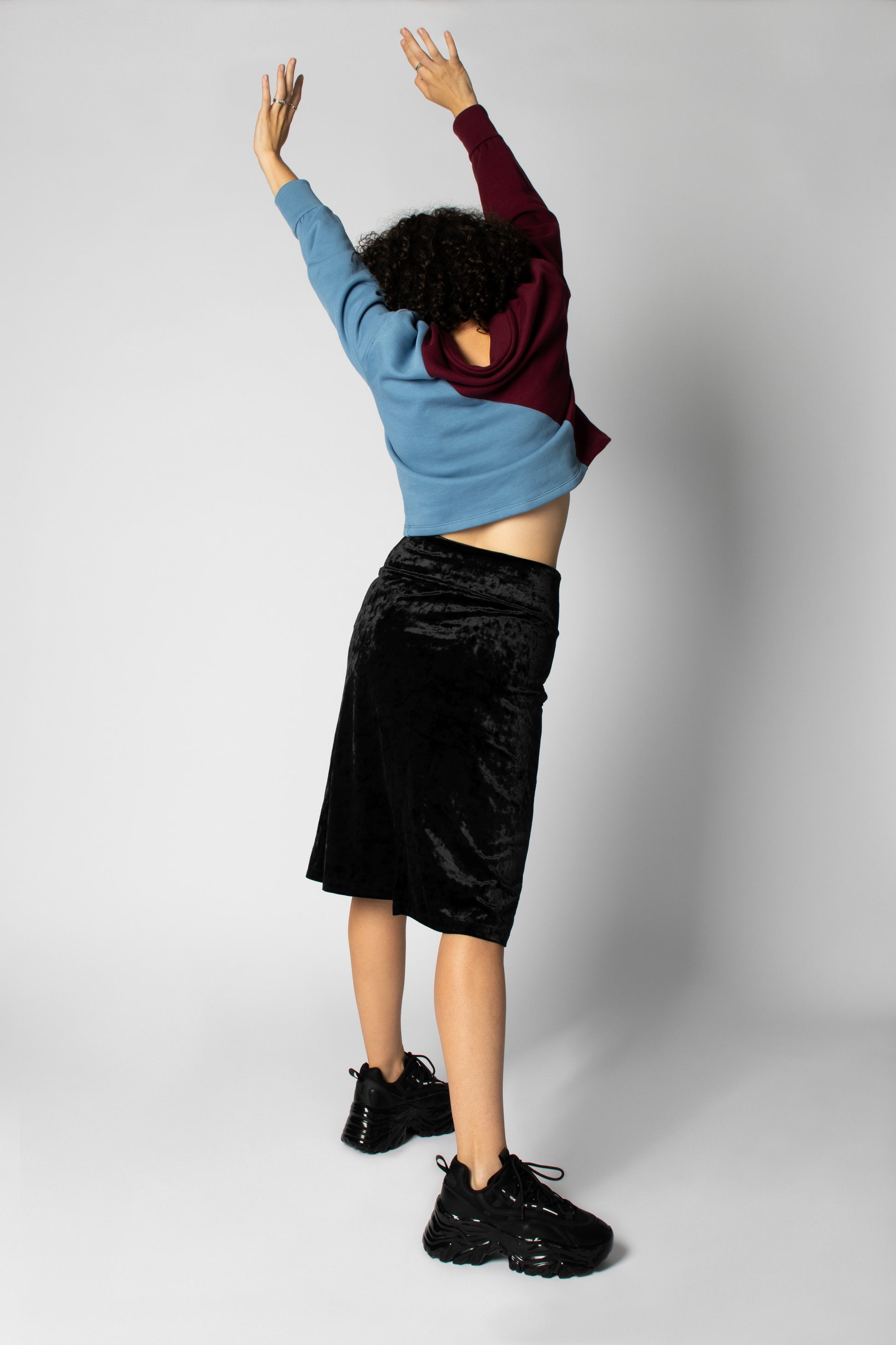 Elle est disponible en velours bleu, bourgogne ou noir, ou en coton noir ou bourgogne