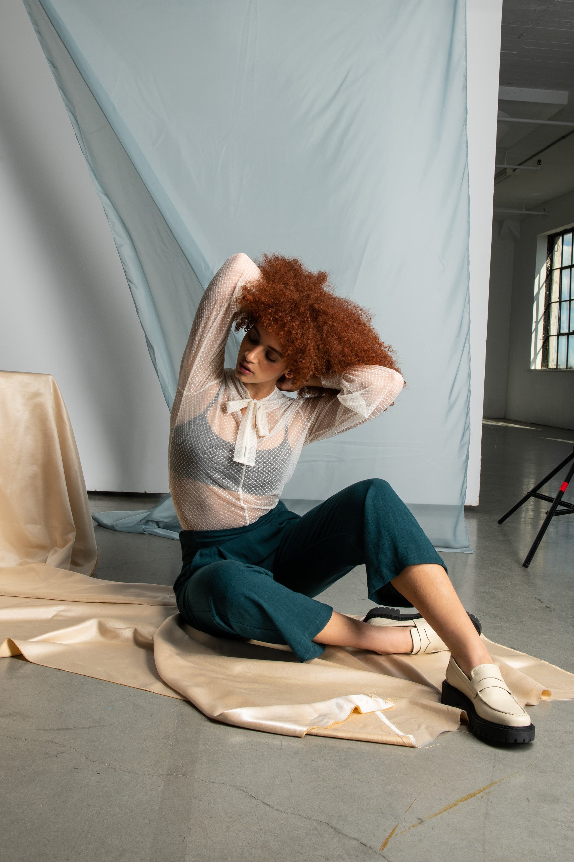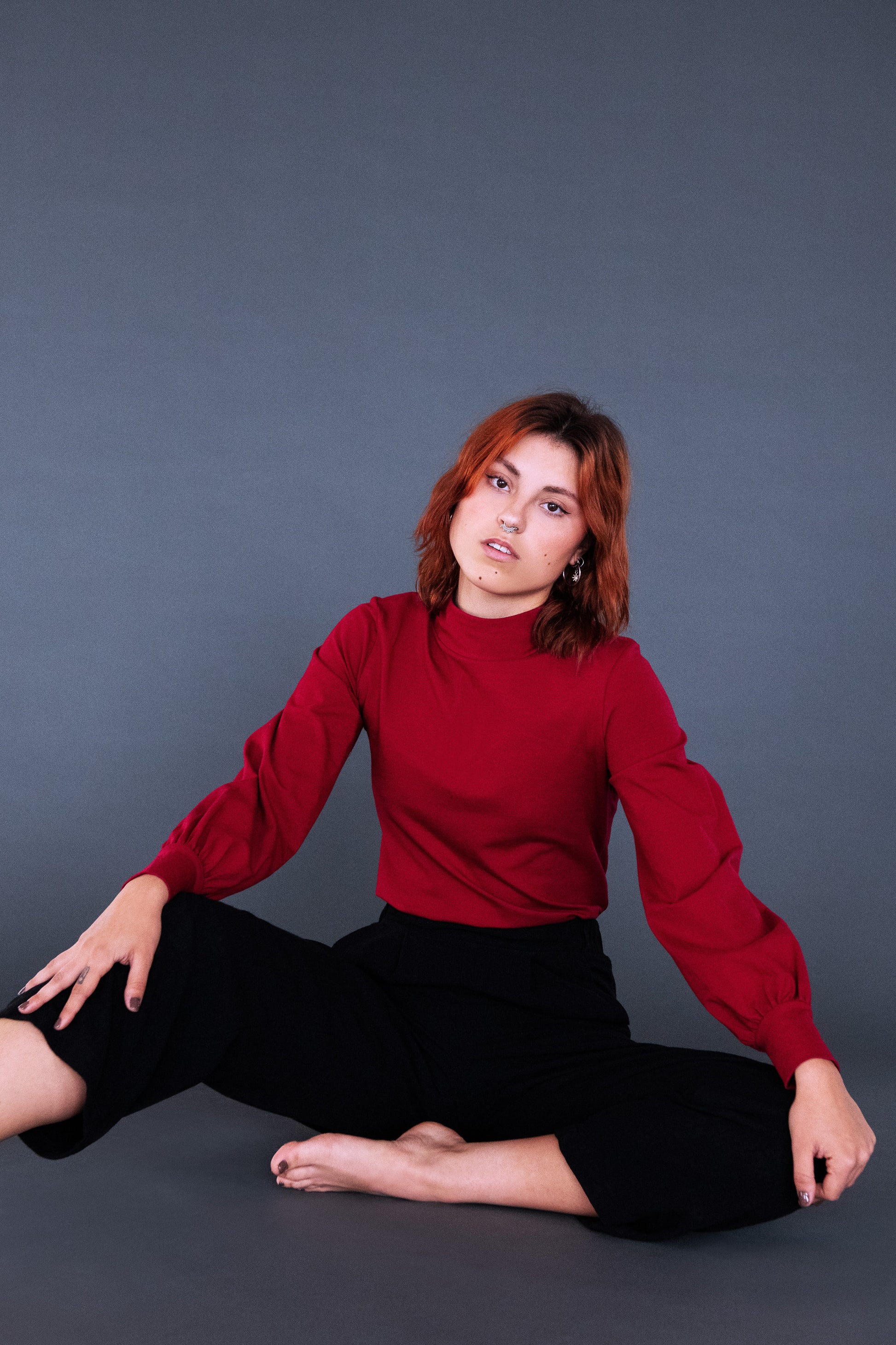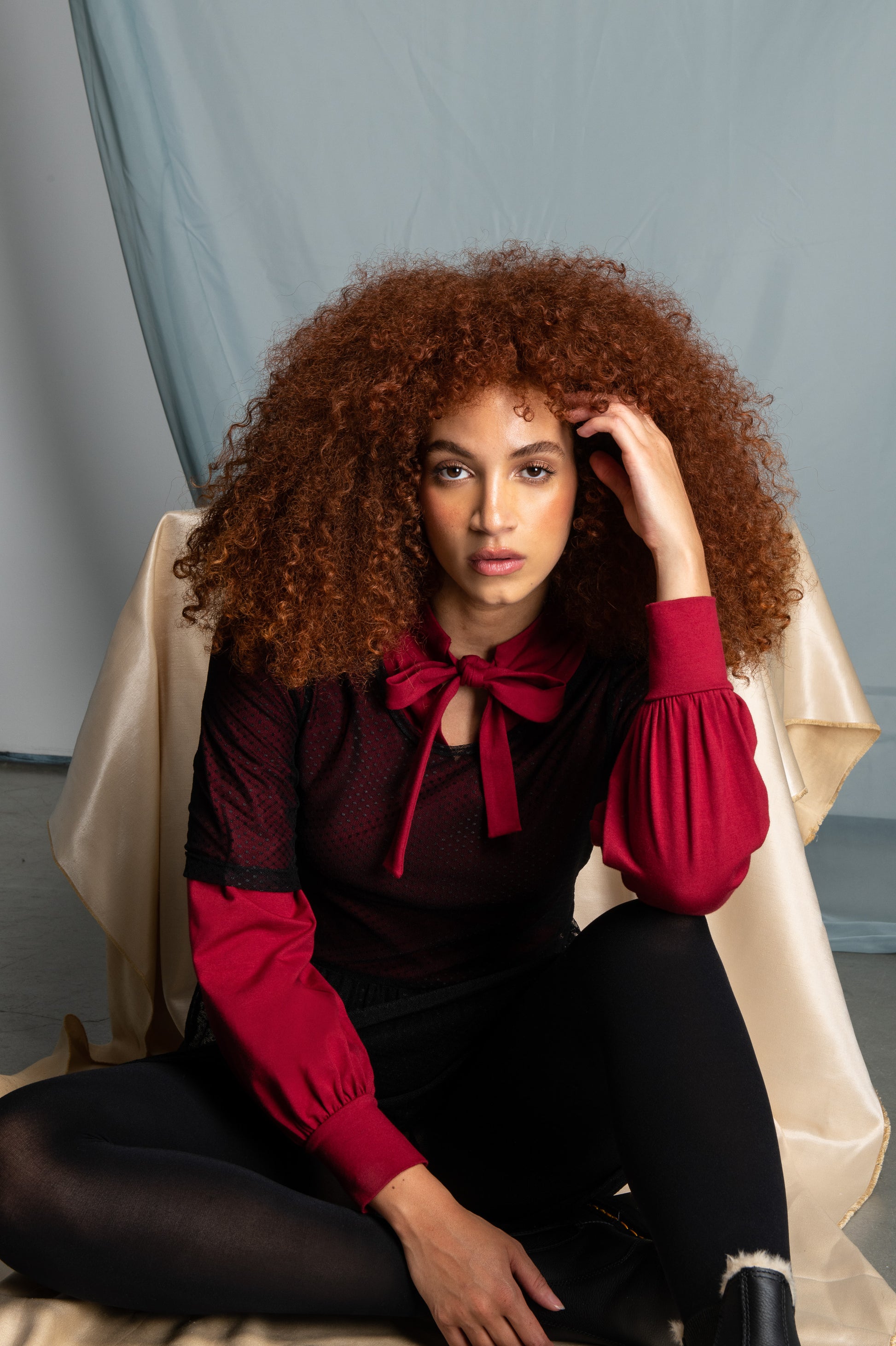 Rien de plus pratique que ce petit haut tout-aller réversible. On peut le mettre en col montant ou en col noué pour deux looks bien différents. Les manches longues sont légèrement bouffantes. Vous pouvez autant le porter à l’intérieur d’un pantalon habillé ou à l’extérieur d’un jean. Ce modèle est disponible en coton ou en dentelle.