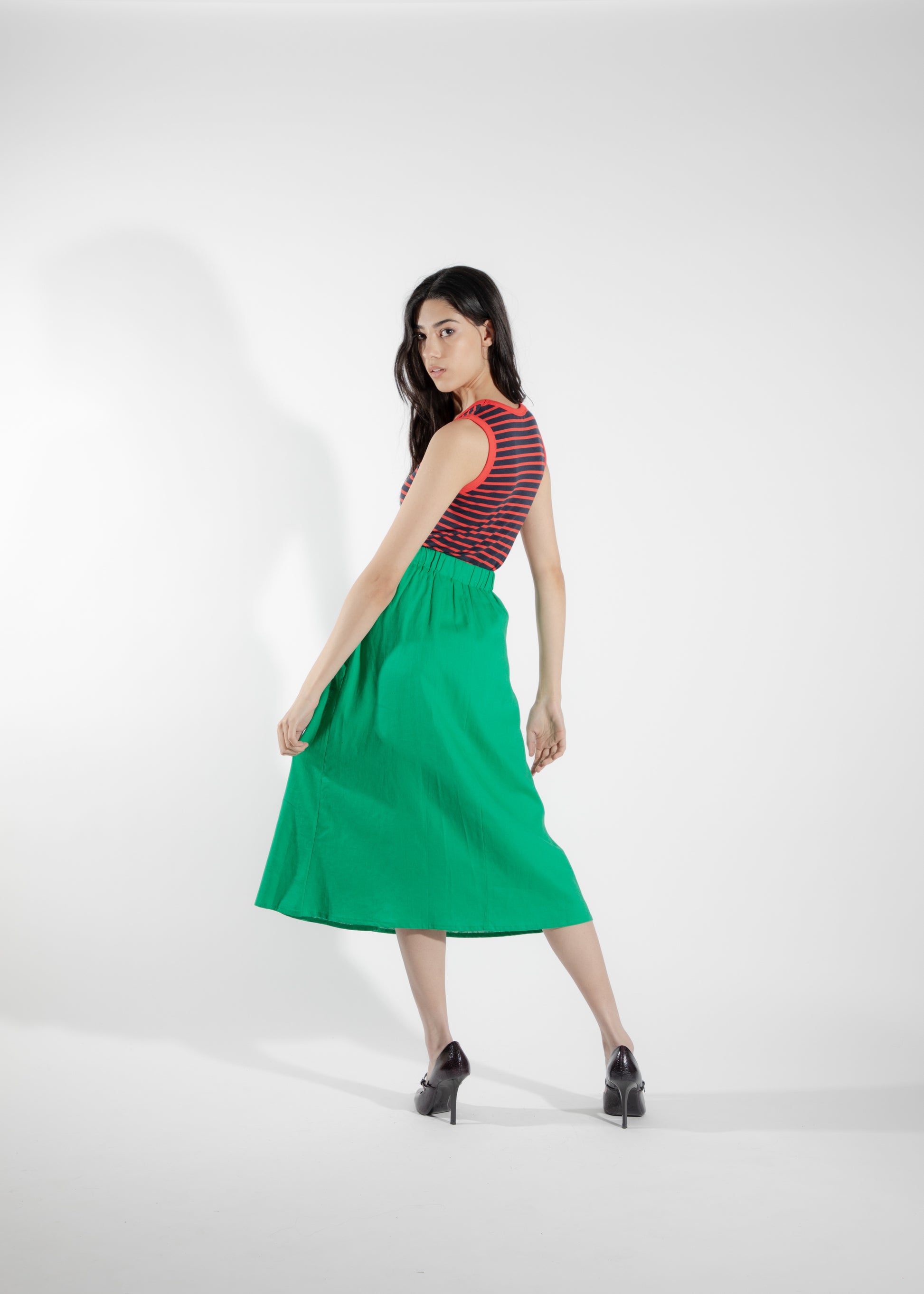 Michelle Khalil J'aime tout de cette jupe : le tissu, le confort, la longueur et... que dire de la couleur ! Un vert flash et lumineux : parfait pour l'été !