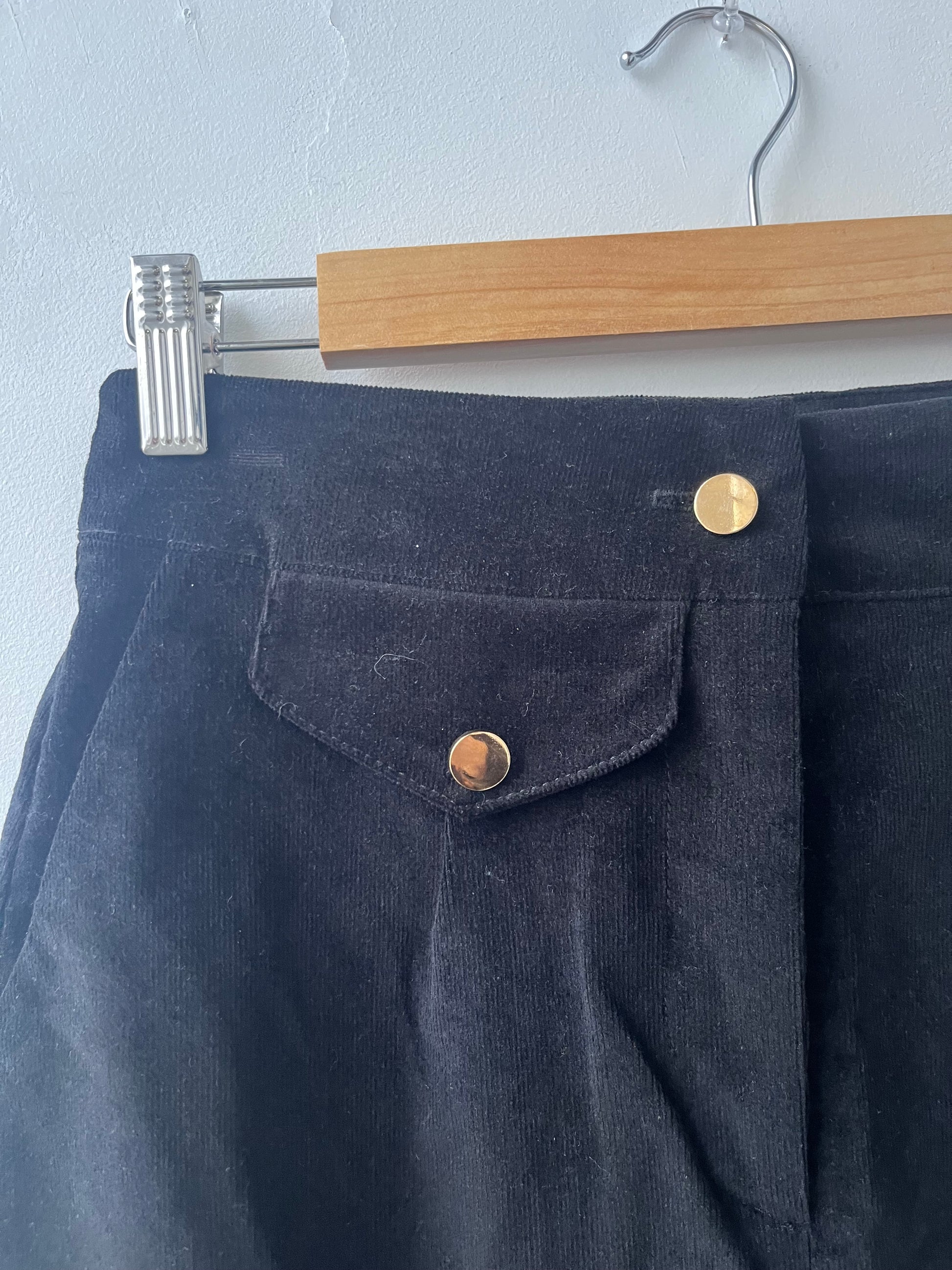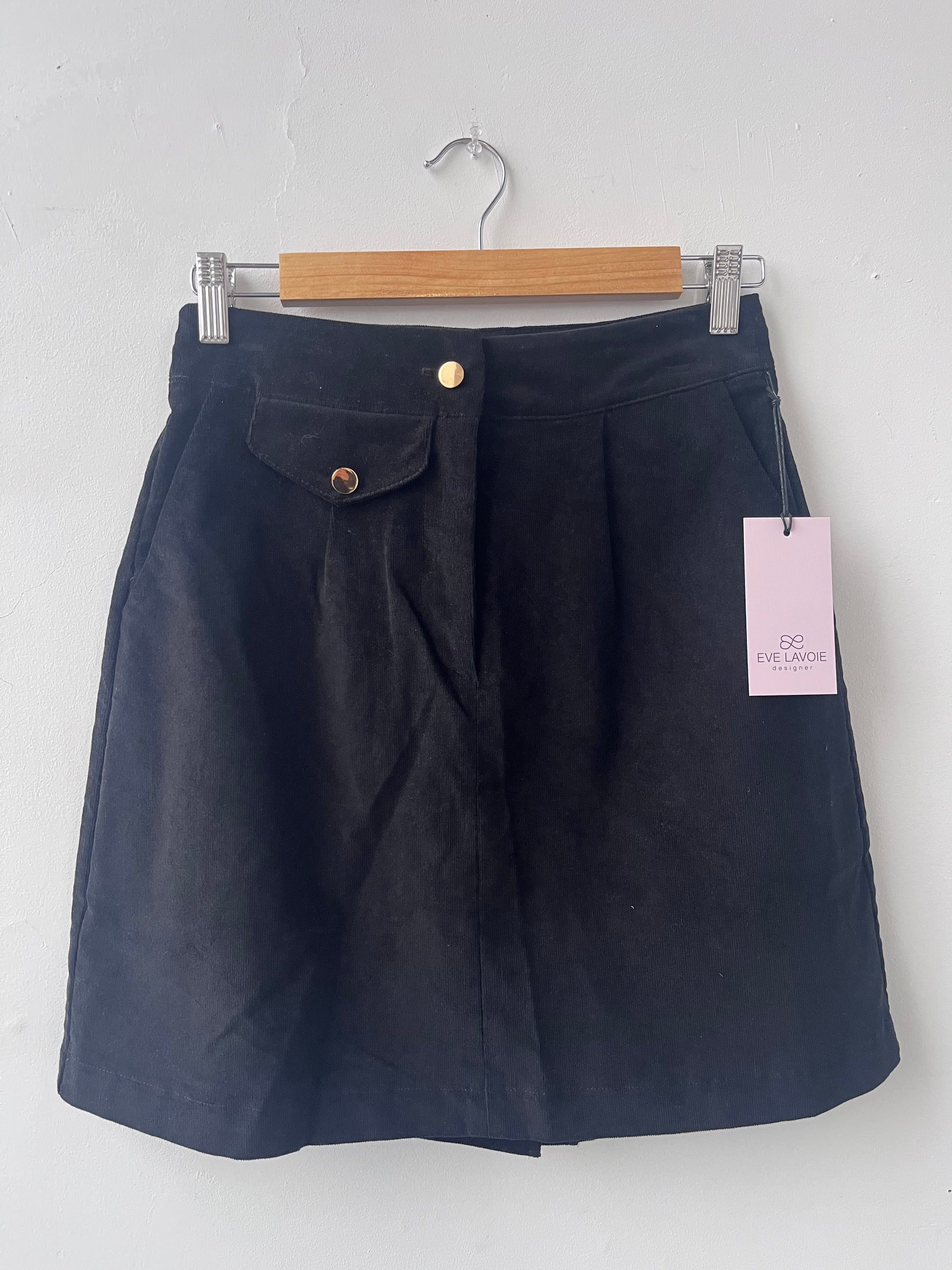 Jupe courte à coupe semi-ajustée, parfaite pour l’automne. Fermeture à glissière YKK à l'avant avec bouton surdimensionné. Longueur au-dessus du genou, poches latérales en biais et fente à l'arrière pour plus d'aisance. Détail de rabat décoratif avec boutonnière. Disponible en corduroy noir, olive ou noisette.
