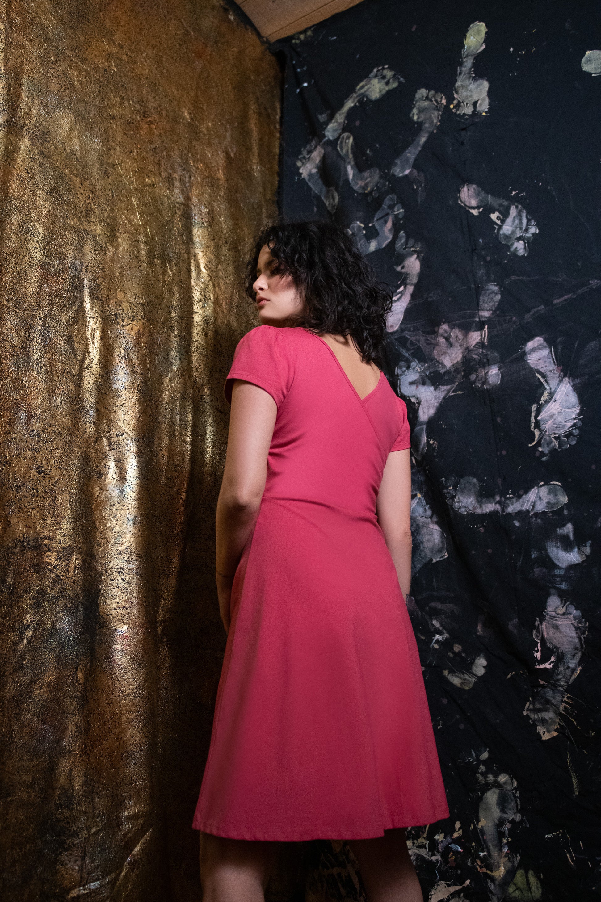 Robe réversible : devant col en U ou cache-cœur. Manches courtes plissées et finition en biais au col. Coupe ajustée au buste et évasée aux hanches. Une robe confortable, qu'on enfile tout simplement, à porter chic ou relax.