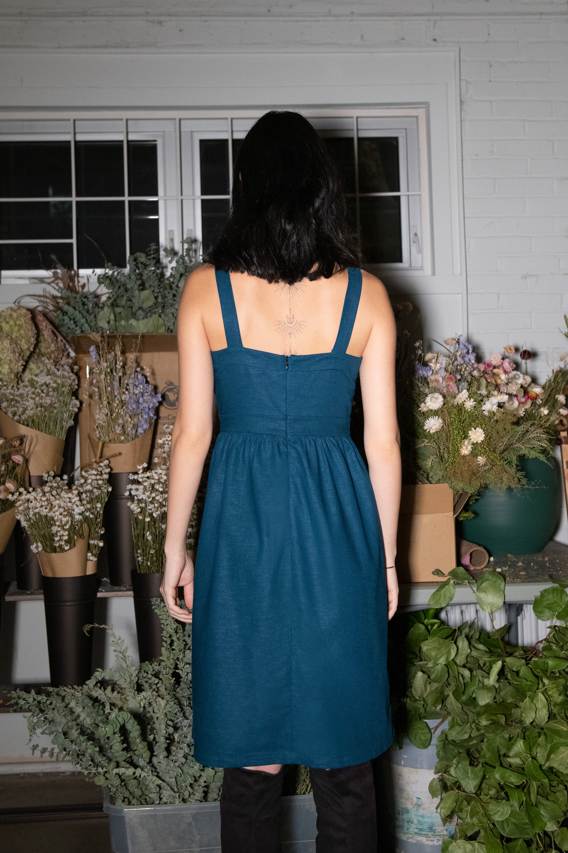 Robe longue en lin de style bustier avec bretelles. Encolure ajustable avec ou sans fronces grâce aux cordons qui peuvent être noués au cou ou bouclés au devant. Taille ajustée en V et plissée au bas. Fermeture à glissière YKK dissimulée à l'arrière. Cette robe vous est offerte en 5 choix (uni ou motif) de lin prélavé. Une nouveauté coup de cœur dans laquelle nous avons trop hâte de profiter de l’été.