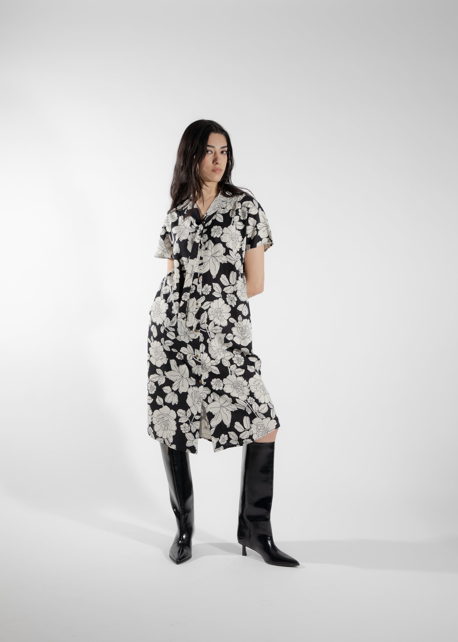 Portez cette robe avec ou sans ceinture, ouverte avec un t-shirt et un pantalon en dessous, tout est possible ! Longueur en dessous des genoux avec boutons pression en laiton antique. Col chemisier et détail style matelot à l’arrière. Ceinture amovible à mettre à la taille ou au col. Poches latérales. Coupe ample.