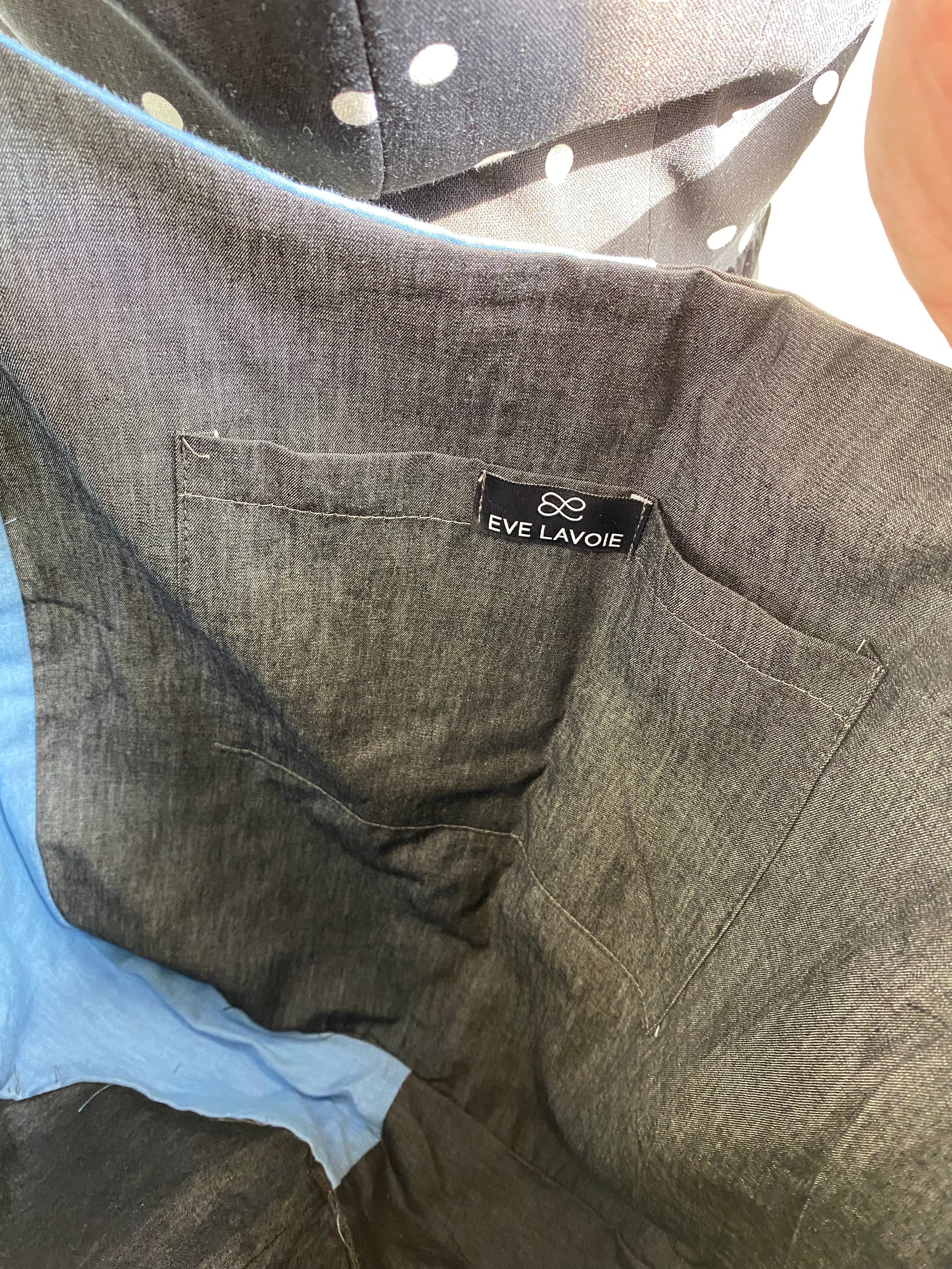 Il est disponible deux deux duo de tissus, soit denim bleu & noir, ou bien en pois & fleur.