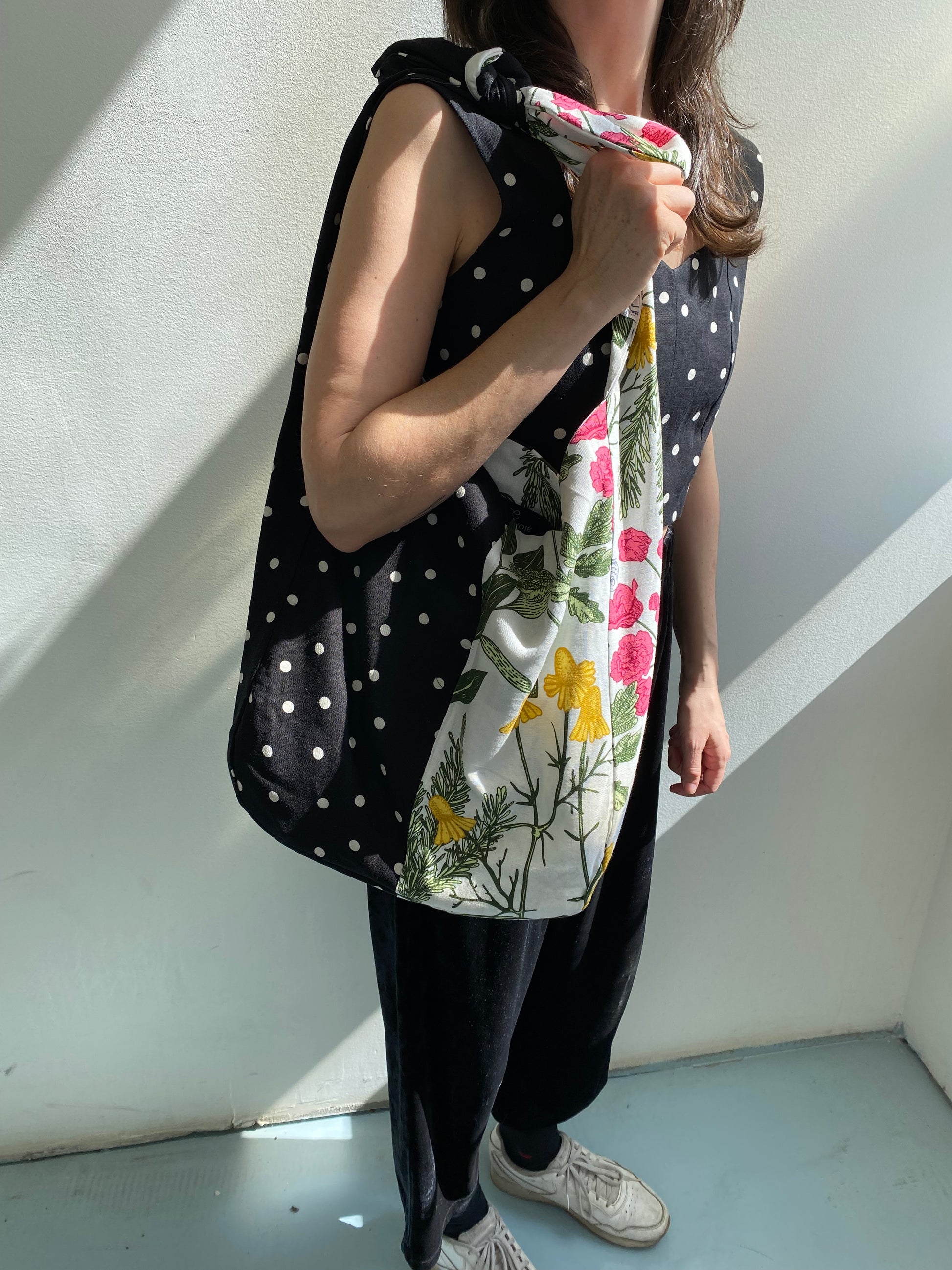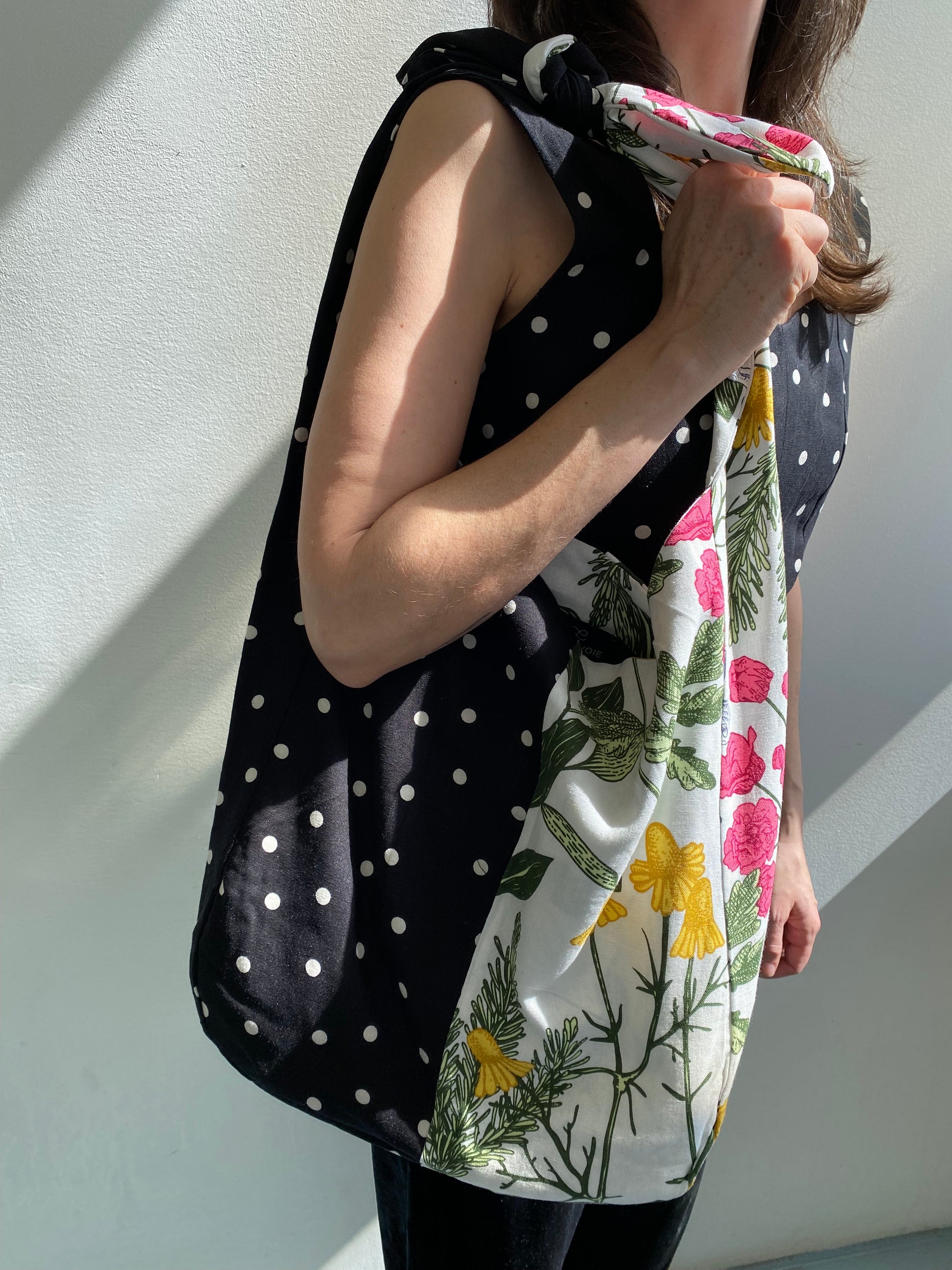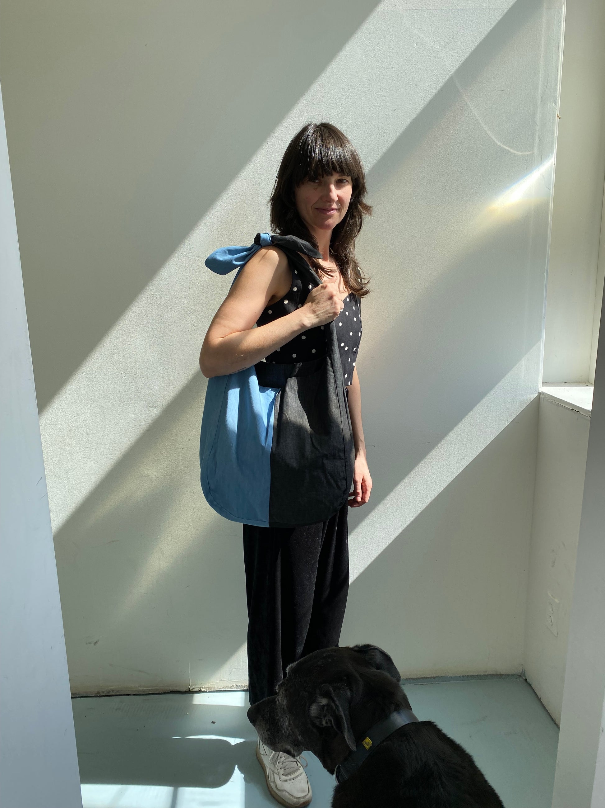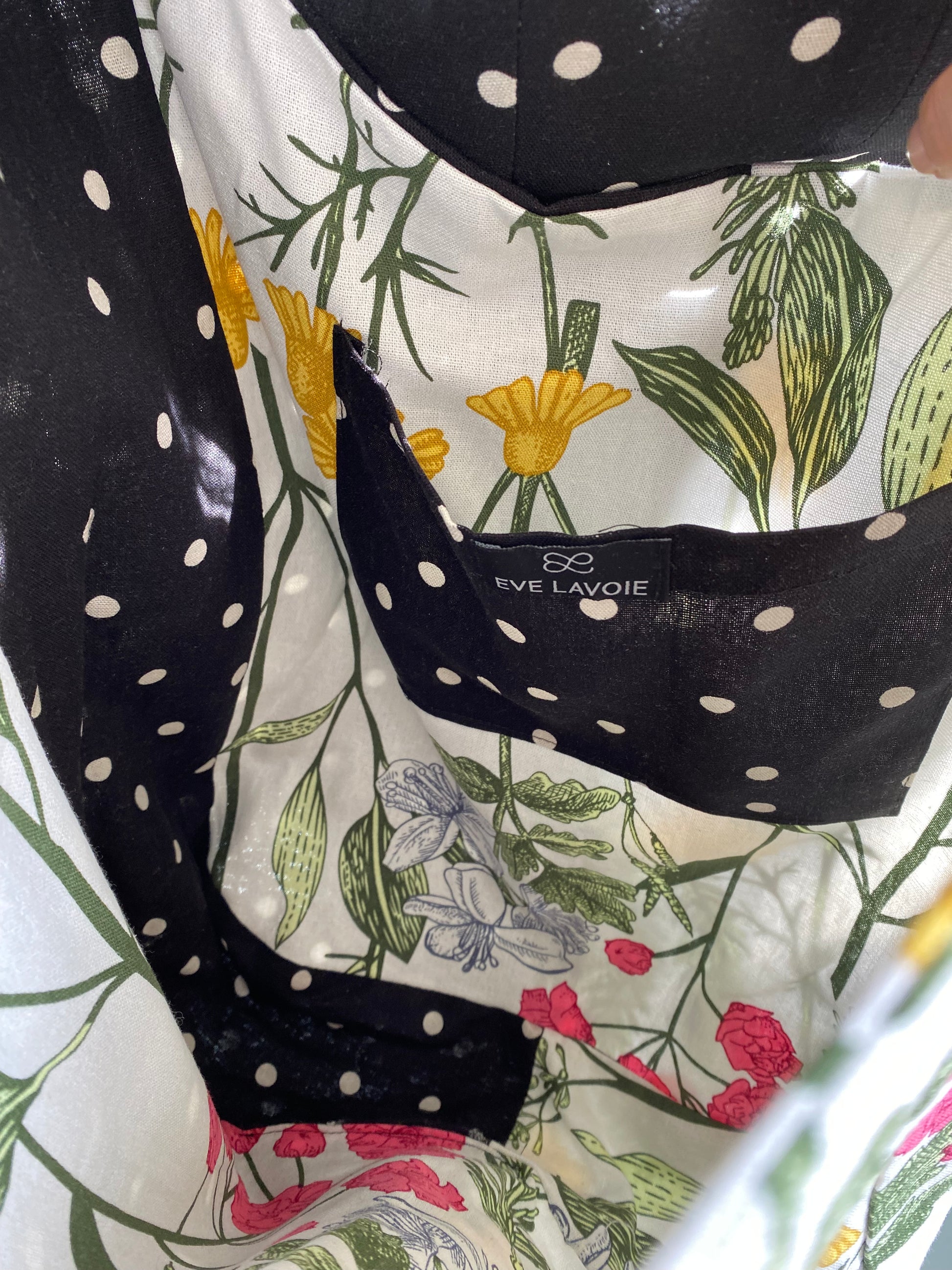 Pour cette saison, nous avons donné une deuxième vie aux tissus de la collection Dialogue. C'est ainsi qu'est né l'idée de confectionner un joli sac en toile, muni d'une poche intérieure.
