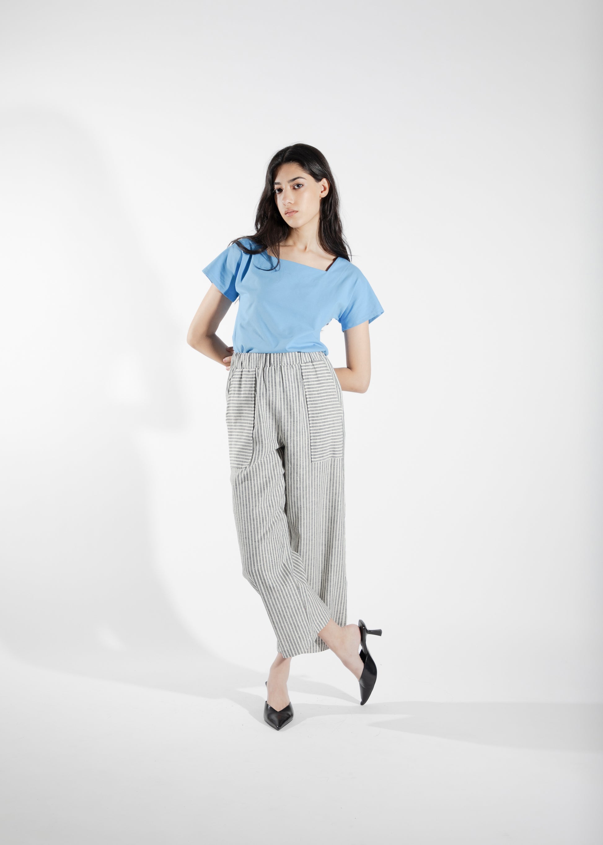 Haut de coton réversible. L’un des côtés est de couleur uni avec encolure carré et l’autre est à motif sérigraphié avec encolure ronde. Les motifs ont été créés par Eve avec une technique particulière d’impression. Les pochoirs qui forment les motifs sont découpés à la main pour une impression sans émulsion et plus intuitive.