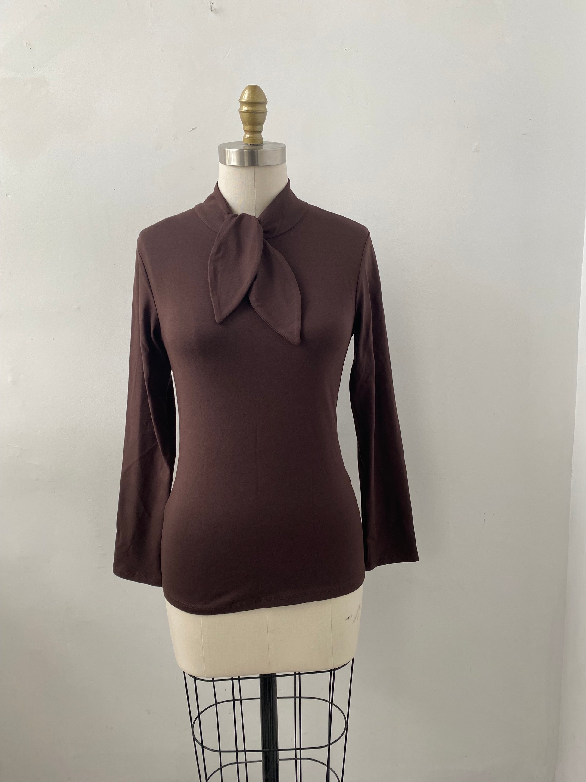 Top ornementé d'une boucle intégrée au col, pour une touche de féminité et d'originalité tout en subtilité. Il a des manches longues et une coupe à la longueur des hanches, idéale pour un look soigné et polyvalent. Disponible en noir, violet, chocolat et blanc.