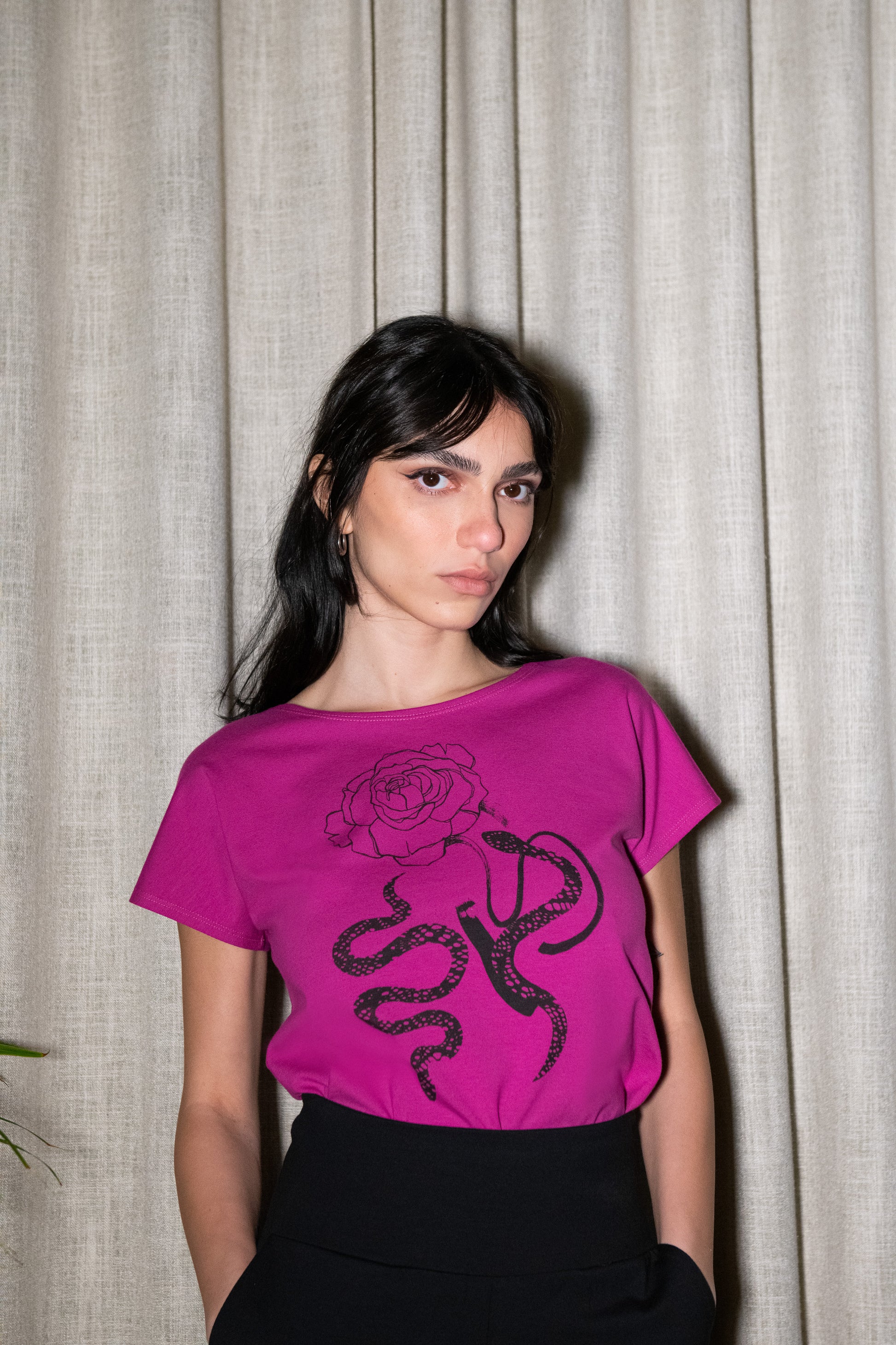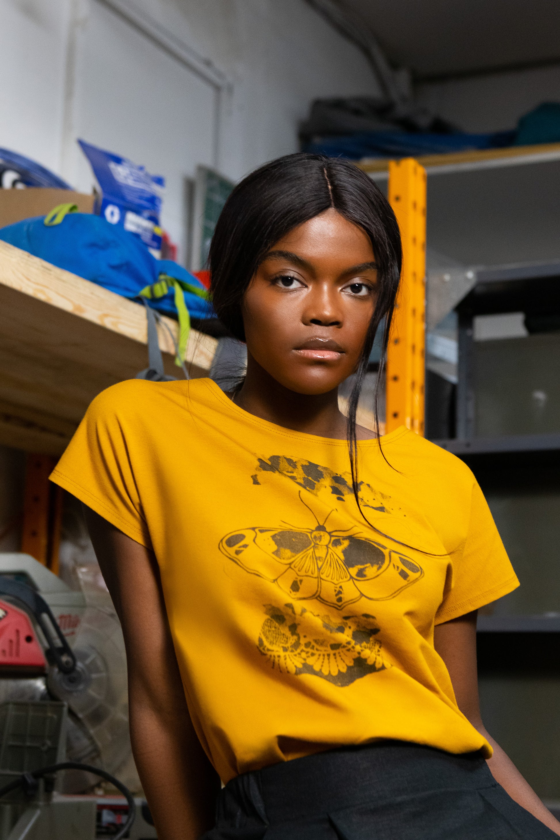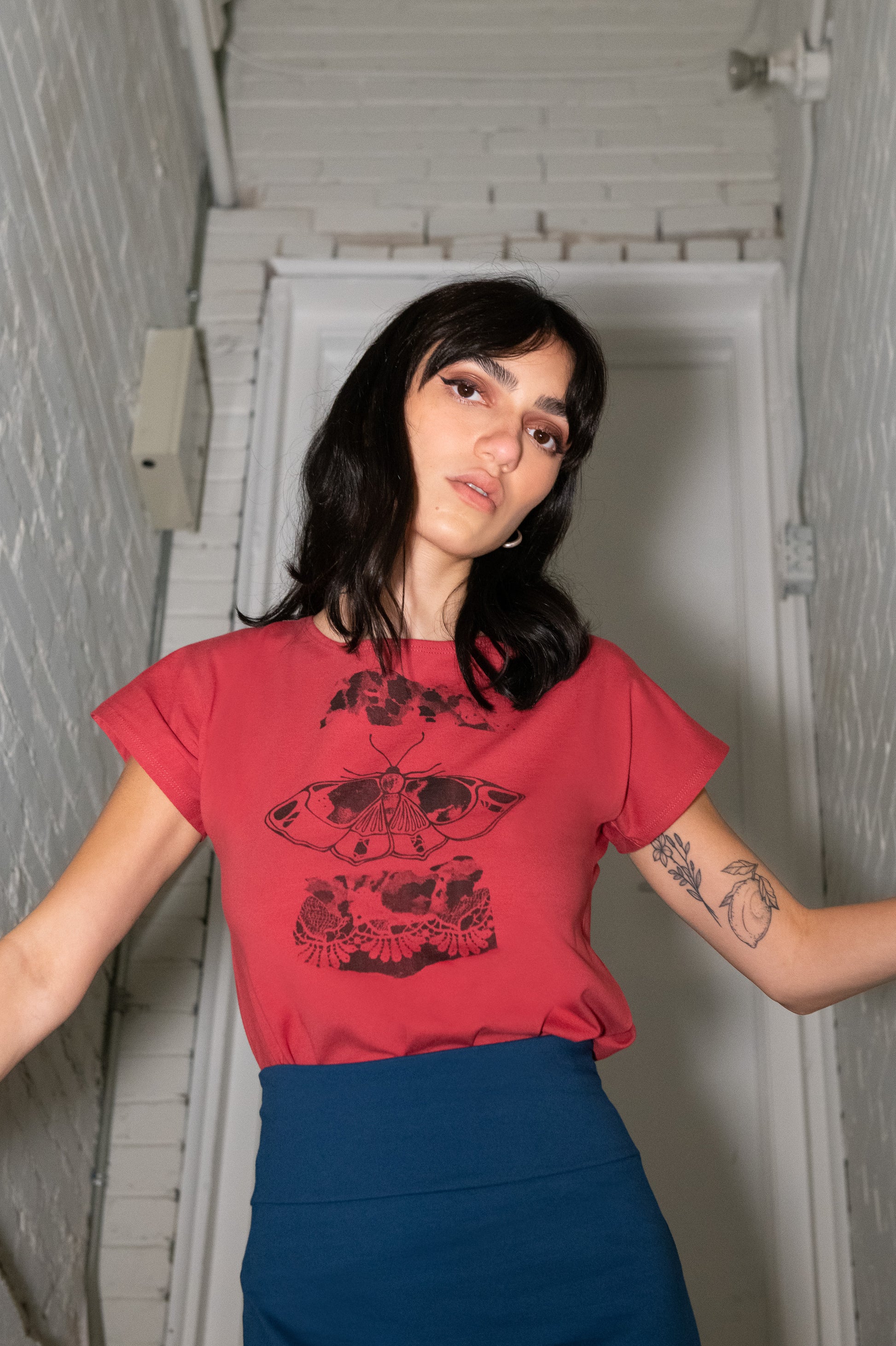 En plus de la douceur du coton et de sa coupe féminine, ce T-shirt est agrémenté d’une sérigraphie créée et imprimée par Eve. Chaque saison, les dessins sont inspirés de la thématique. Cet été, vous pourrez choisir entre les œuvres imprimées « papillon de nuit/dentelle » ou « serpents/pivoine ».